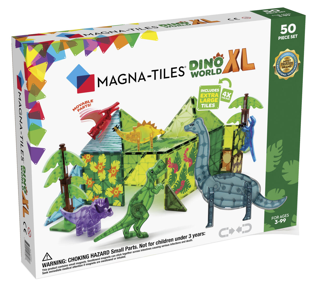 50 deler/pk. Dette store settet med dinosaurtema består av 6 store firkanter, 6 store rette trekanter, 4 store likesidede trekanter, 8 små firkanter, 2 rette trekanter, 16 bladstykker, 2 trestammer, 1 Velociraptor, 1 Triceratops. 1 Stegosaurus, 1 Pteranodon, 1 Tyrannosaurus rex og 1 Brachiosaurus. Produktet er designet med barn i tankene, med letthåndterlige og sikre magnetiske plater som oppmuntrer til forståelsen av geometriske konsepter. Den glatte overflaten på delene er designet for å motstå flekker og riper. Av ABS. Fra 3 år.