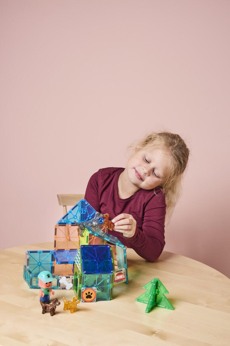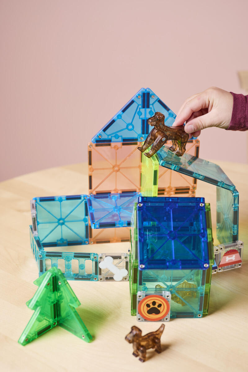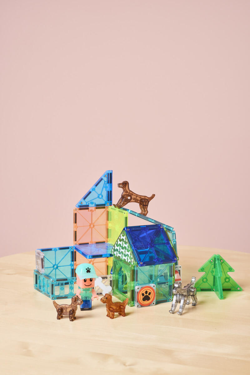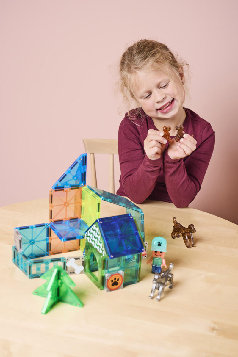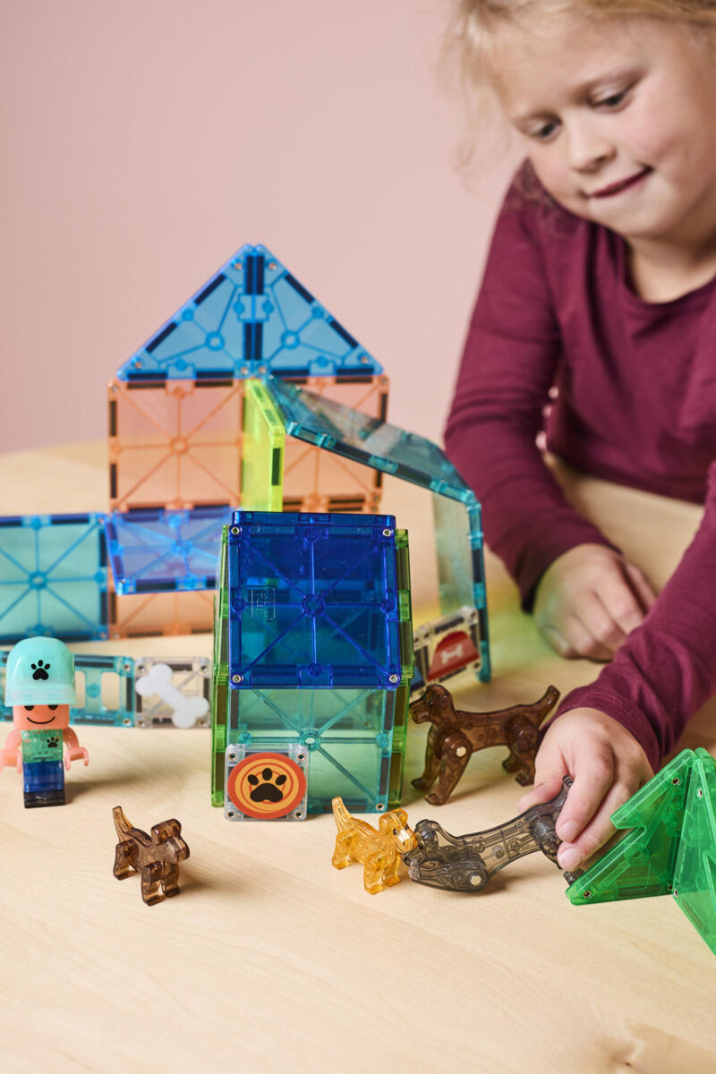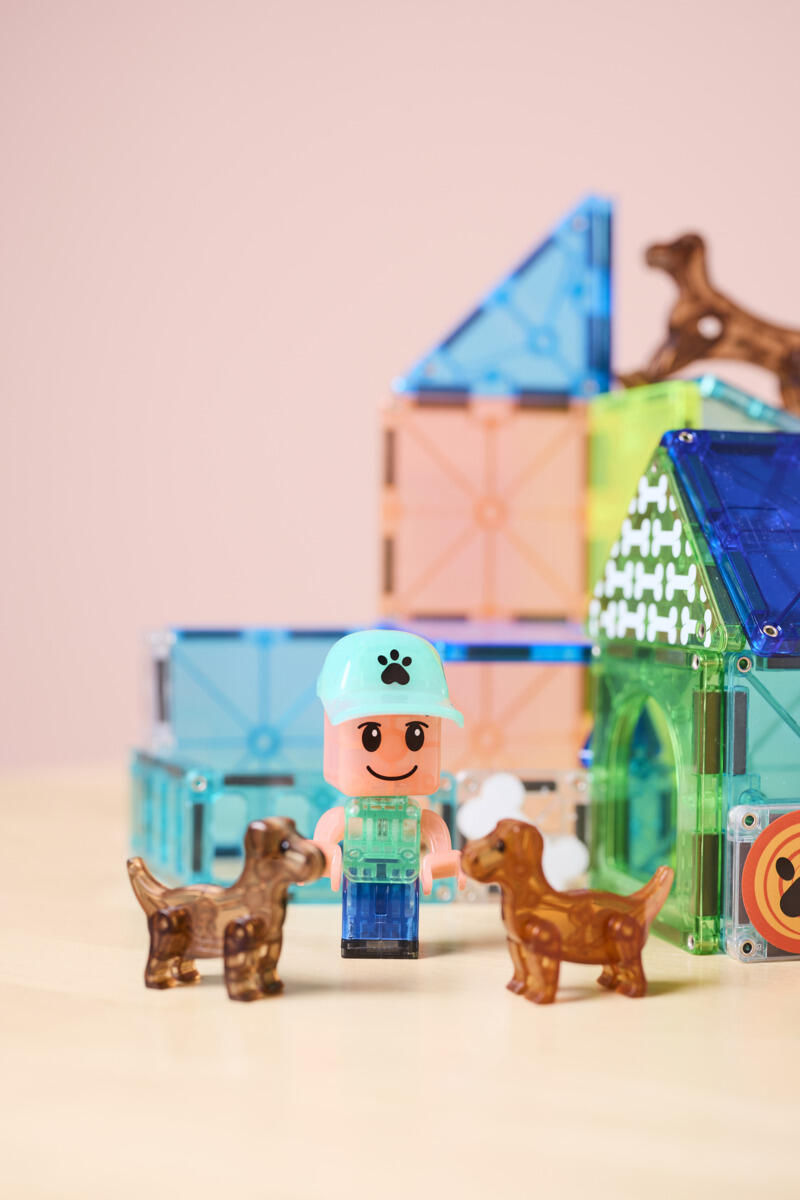 27 deler/pk. Bygg et hundedagis til dine nye venner ved hjelp av de magnetiske platene i standard- og mikro-størrelse. Settet inneholder en hundepasser og fire hunder i forskjellige størrelser. Utforsk årsak og virkning samtidig som øye-hånd-koordinasjon og finmotorikk trenes. Den glatte overflaten på bitene er designet for å motstå flekker og riper. Størrelse på figur cirka 7 cm. Laget av ABS. PVC-fri. Fra 3 år.