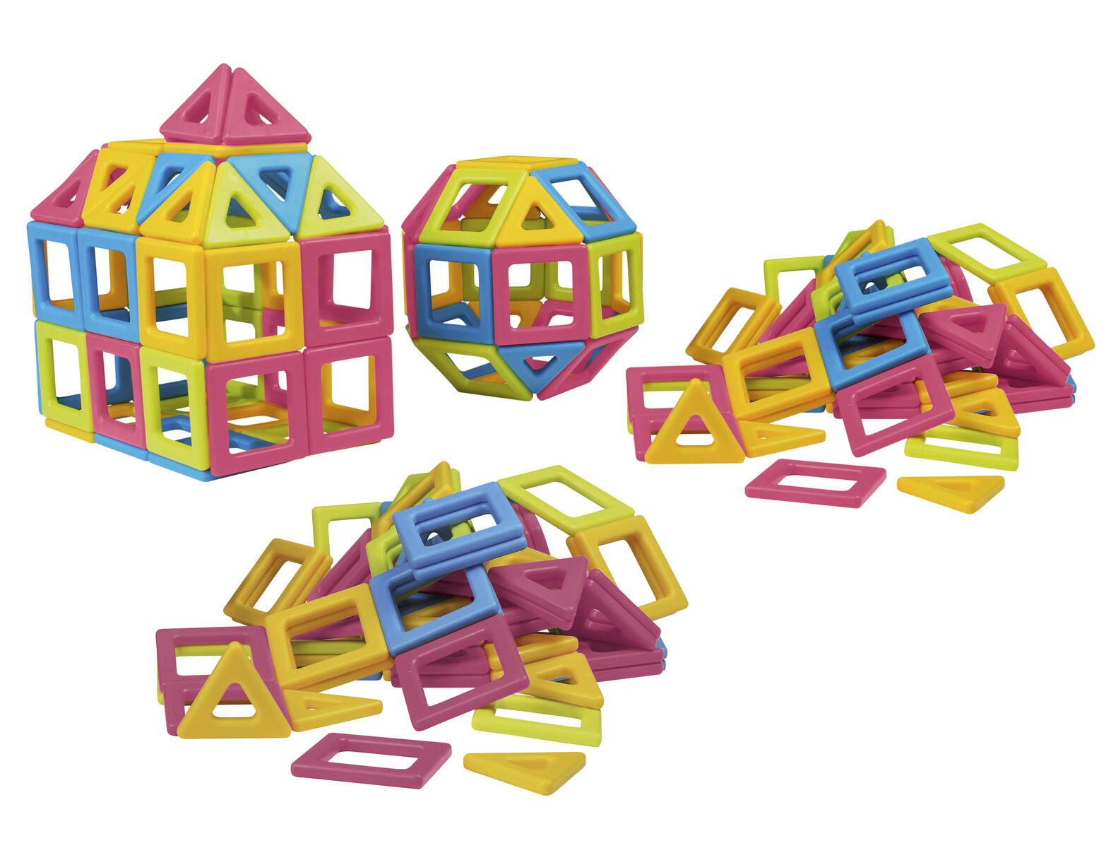 96 deler. La barna utforske former og magnetisme gjennom morsom og lærerik byggelek. Settet inneholder 36 kvadrater og 60 trekanter i 4 ulike farger. Mål på kvadrat 6x6 cm, og trekanter 5,5x5,5 cm. Av ABS-plast. Fra 3 år.