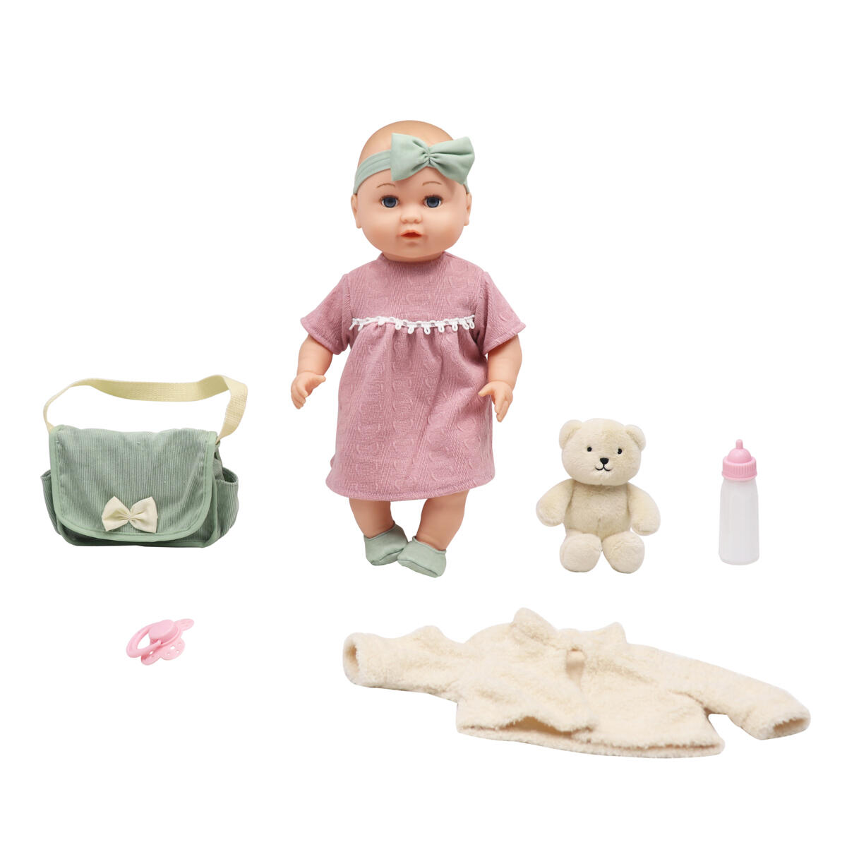 En dukke med bevegelige armer og ben med mykstoppet kropp. Jakke, veske, bamse, smokk og tåteflaske følger med. Dukkens armer, hode og ben er av PVC, uten forbudte ftalater. Lengde 40 cm. Fra 2 år.