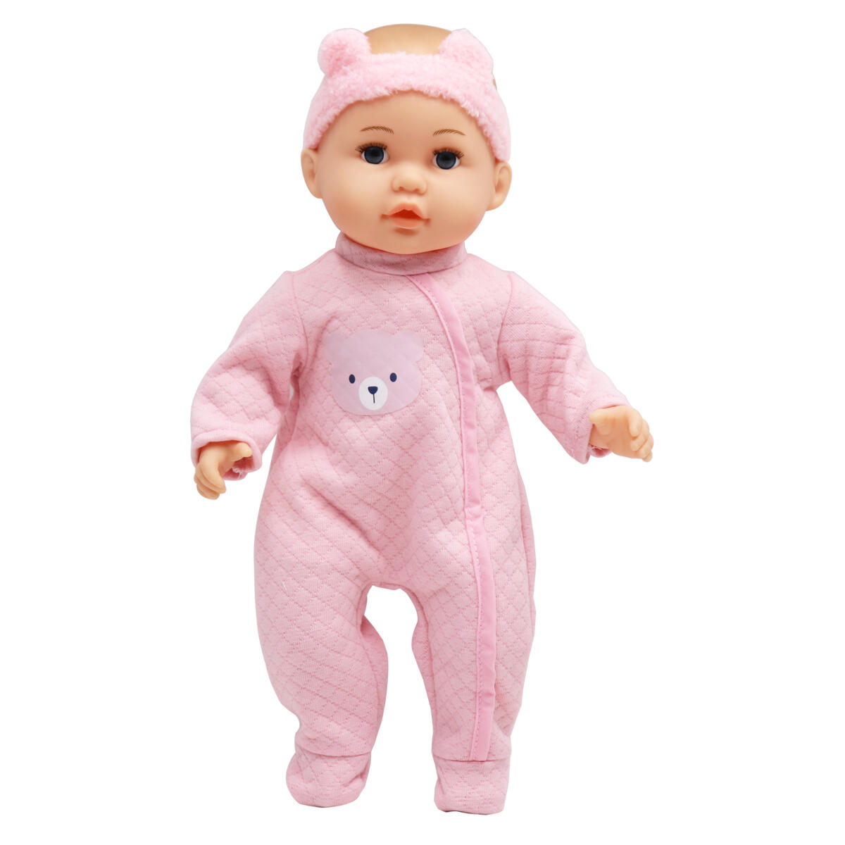 En dukke med bevegelige armer og ben med mykstoppet kropp. Jakke, veske, bamse, smokk og tåteflaske følger med. Dukkens armer, hode og ben er av PVC, uten forbudte ftalater. Lengde 40 cm. Fra 2 år.