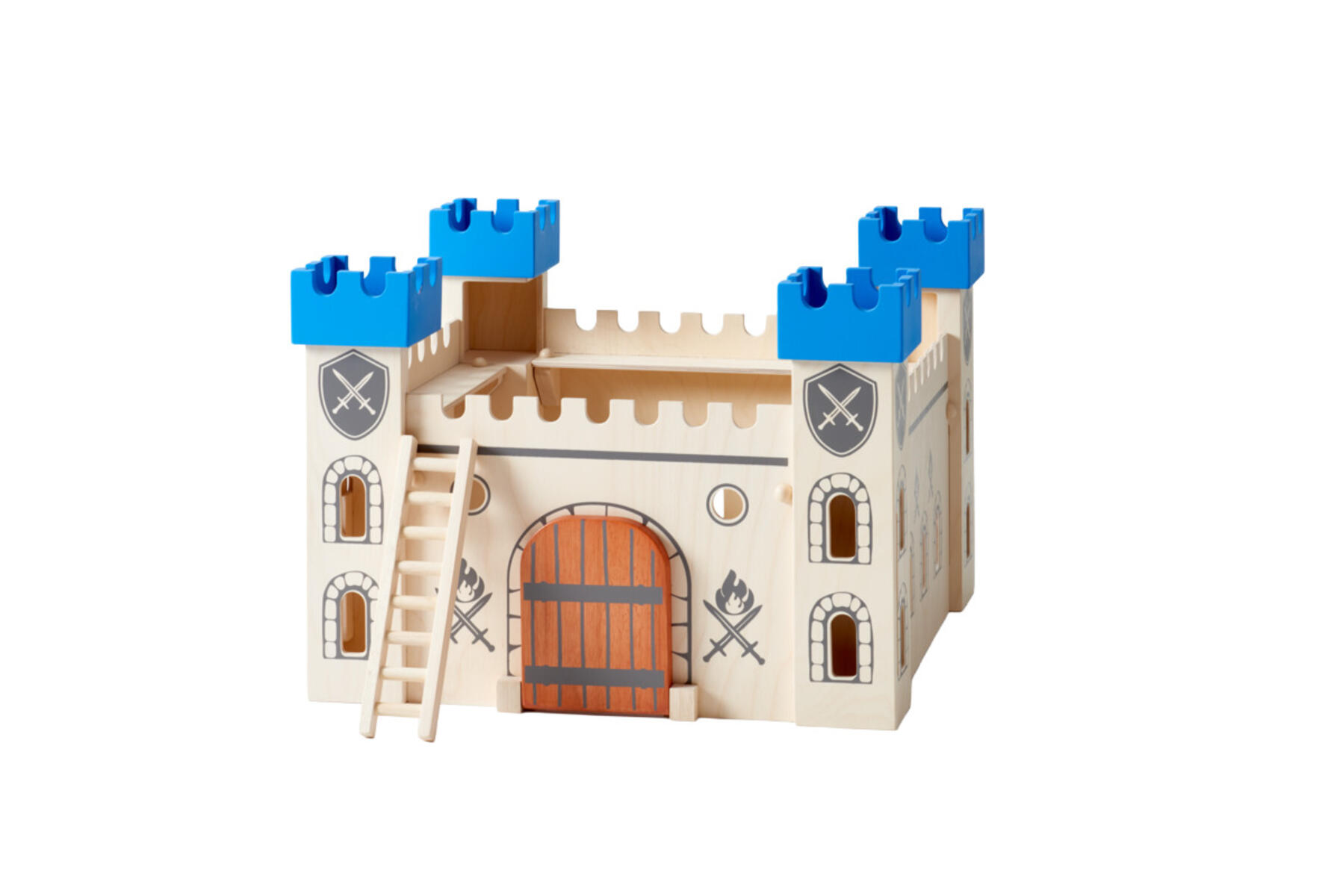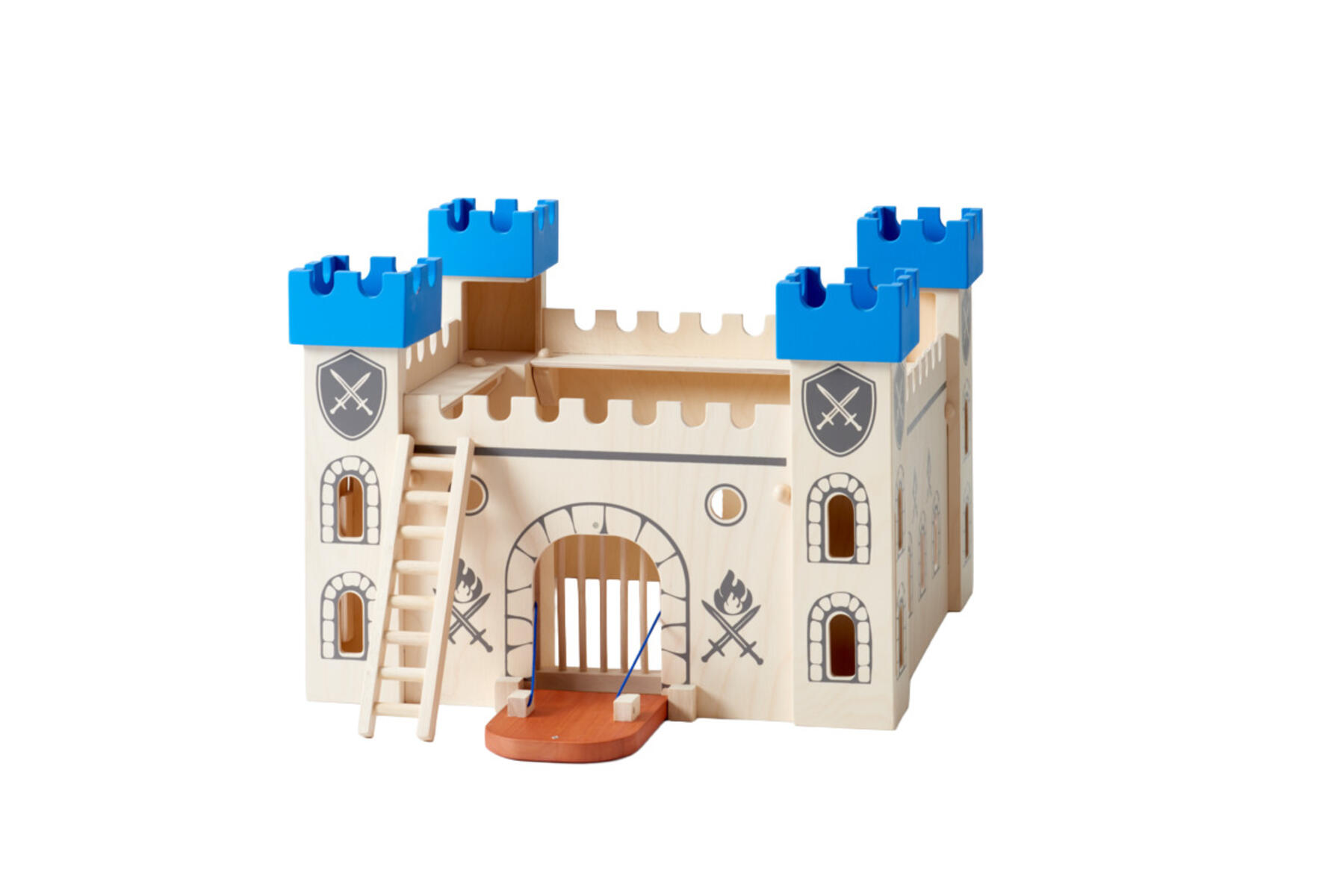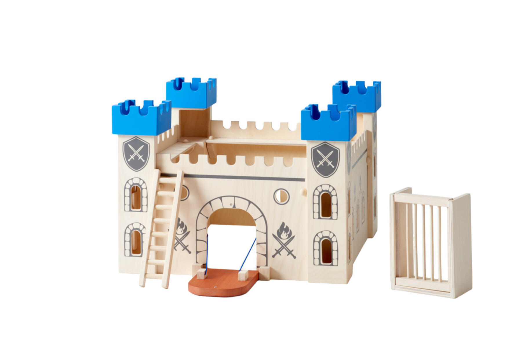 Pass på så ikke drager og monstre kommer innenfor ridderborgens murer! En flott ridderborg av FCS-godkjent kryssfiner med stige og fengsel. Settes enkelt sammen uten skruer. Mål: 46x46 cm. Tårnets høyde 34 cm. Figurer følger ikke med. Fra 3 år.