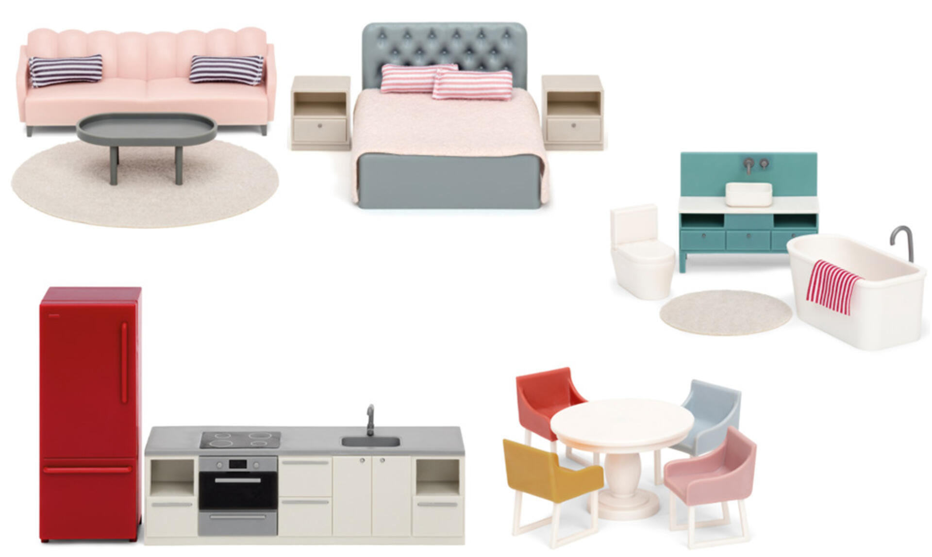 Komplett møbelsett til Lundbyhuset, 135541. Kjøkken, bad, soverom, stue og spisestue. Kjøleskap og kjøkkenbenk med vask, komfyr og platetopp, toalett, badekar, servantskap, seng, nattbord, sofa salongbord, teppe spisestue. Laget i plast.