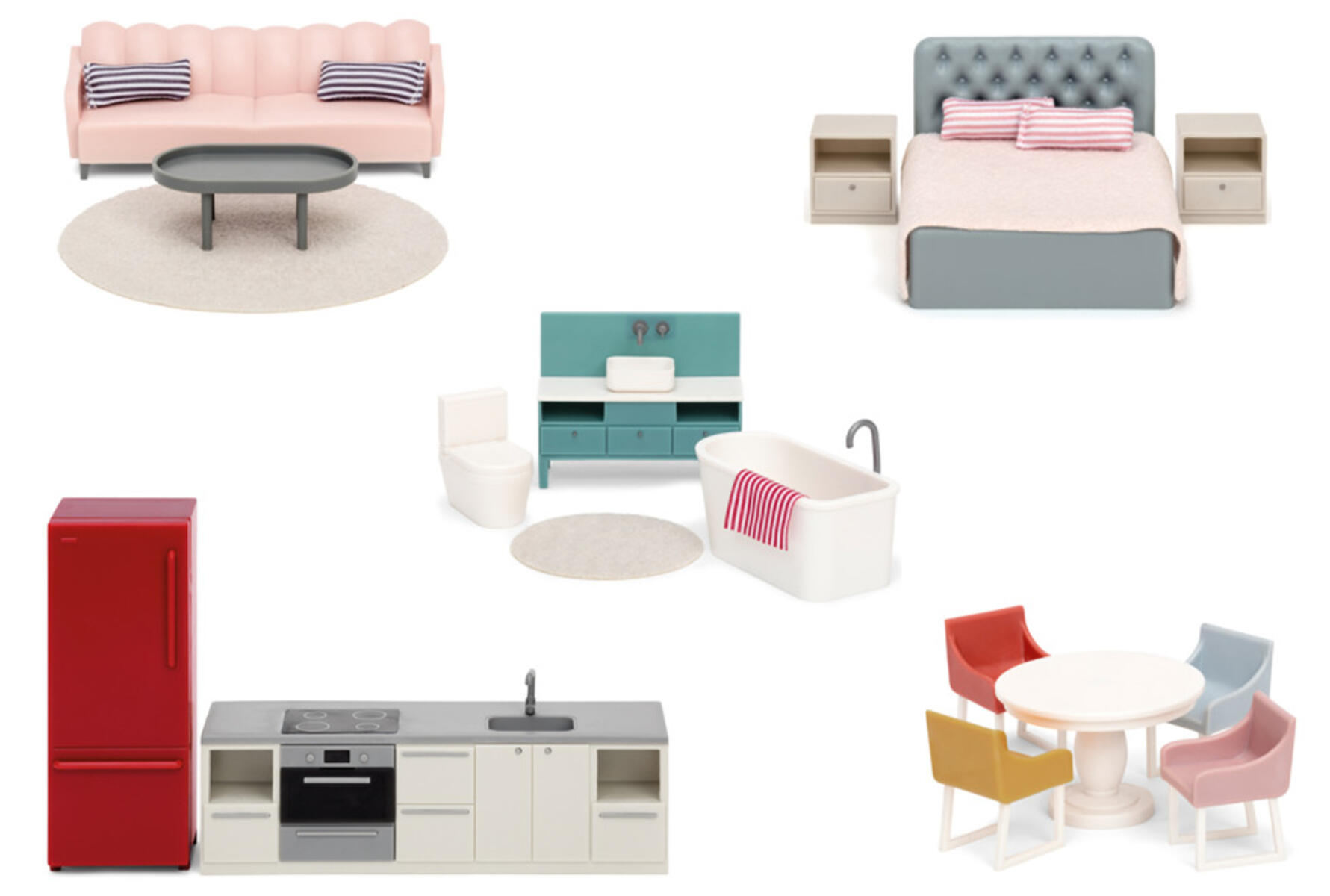 Møbler til dukkehus: Oppvaskbenk, komfyr, kjøl/frys, 2 stoler og 1 bord.. Mål på kjøl/frys: høyde 9 cm, bredde 4 cm. Av FSC-merket tre. PVC-fri. Fra 3 år.