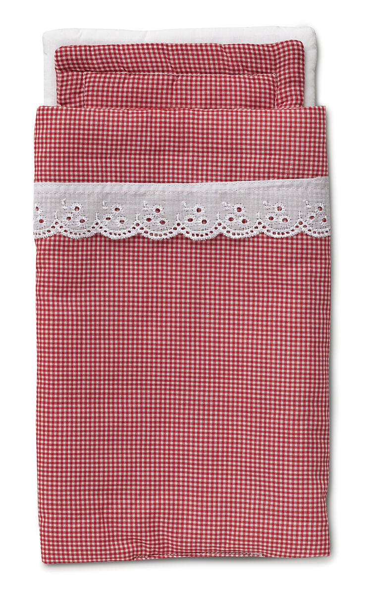Dette fine sengesettet passer perfekt til dukkesengen og dukkevognen. Settet inkluderer en madrass, dyne og pute. Farge kan variere. Mål: 43x32 cm. Fra 3 år.