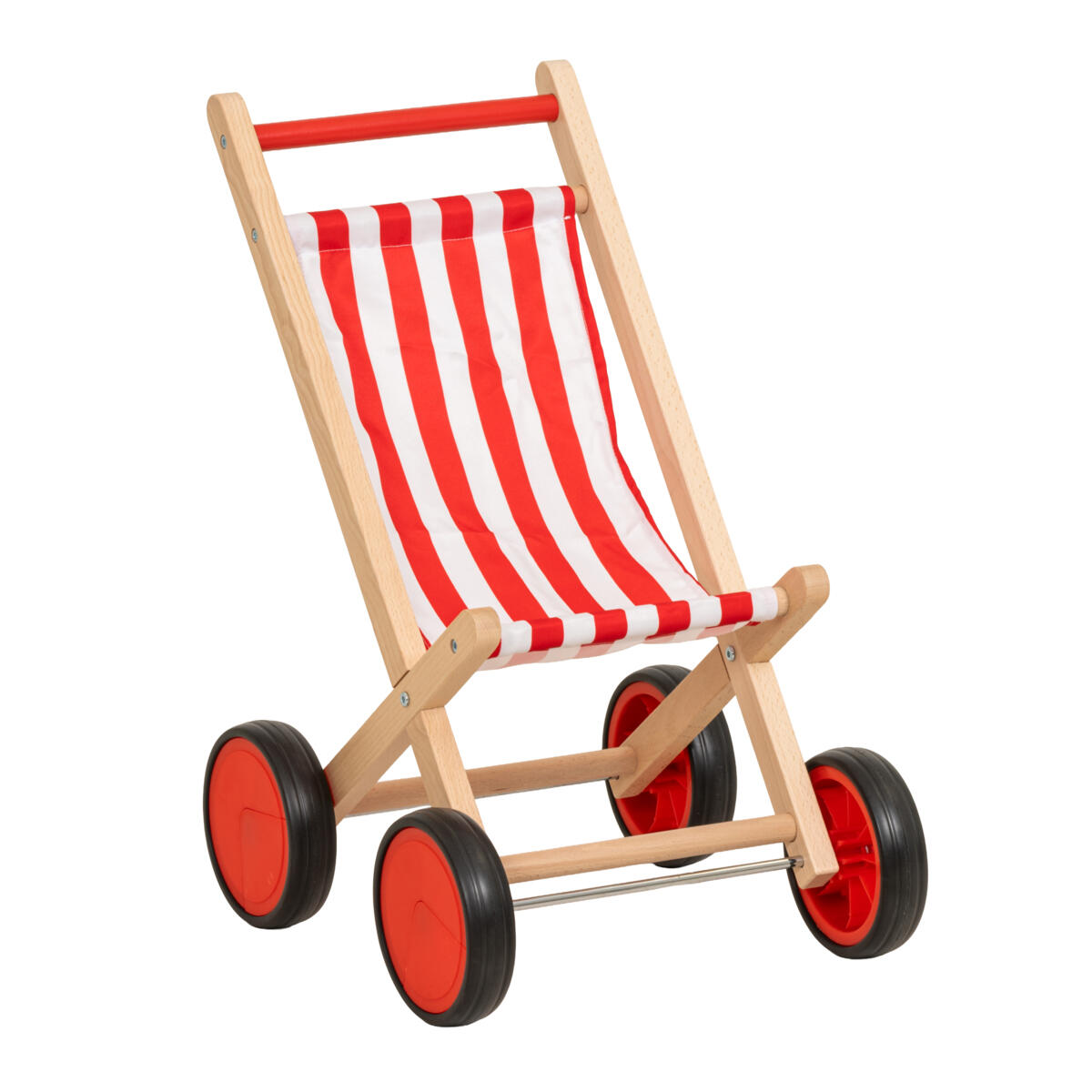En dukkevogn med kalesje i tekstil og store stillegående hjul. Kosedyr og dukker kan ligge eller sitte i vogna. Håndtakshøyde 54 cm. Leveres umontert. Laget av FSC-merket tre. PVC-fri. Mål: 39x30x54 cm. Fra 18 måneder.