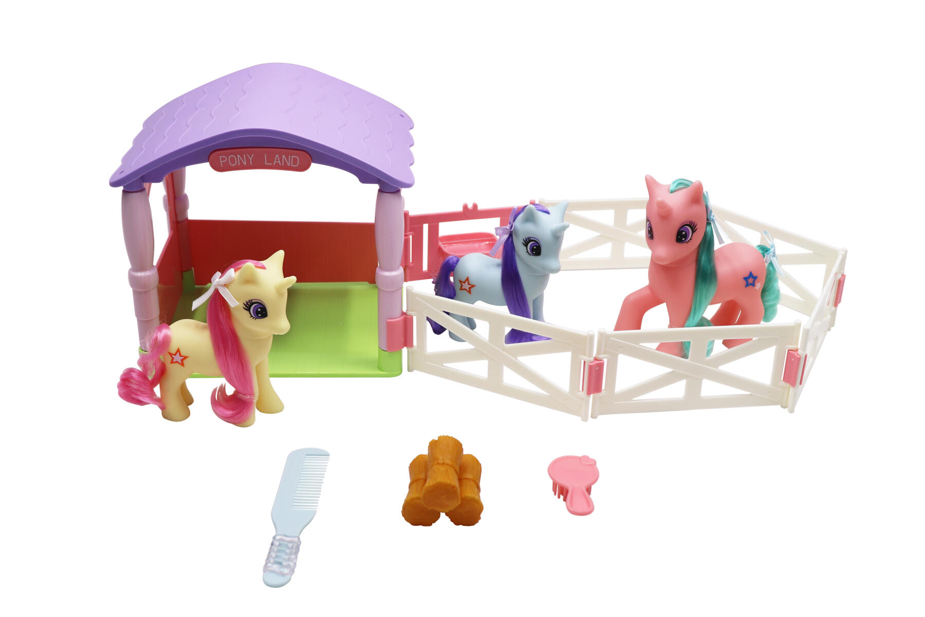 14 deler/pk. Et stort sett med eventyrhester i ulike størrelser og morsomme farger. I settet inngår også mye hårtilbehør til å sette i hestens man. Av PE og PVC, uten forbudte ftalater. Fra 3 år.