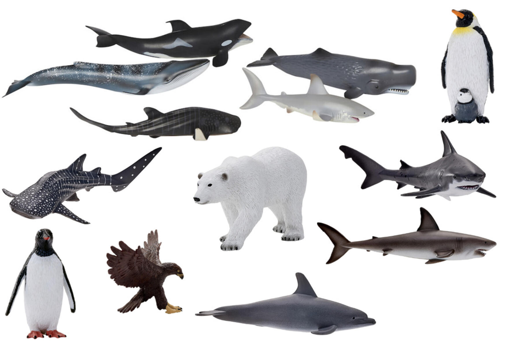 13 stk/pk. Havets dyr i en enklere versjon. Fasinerende og detaljerte dyr som lever i havet. Inneholder bl.a. knølhval, gråhval, spekkhogger, hvithai og spermhval. Lengde 22–30 cm. Størrelse 6,5-16 cm. Laget av TPR og PVC, uten ftalater. Fra 3 år.