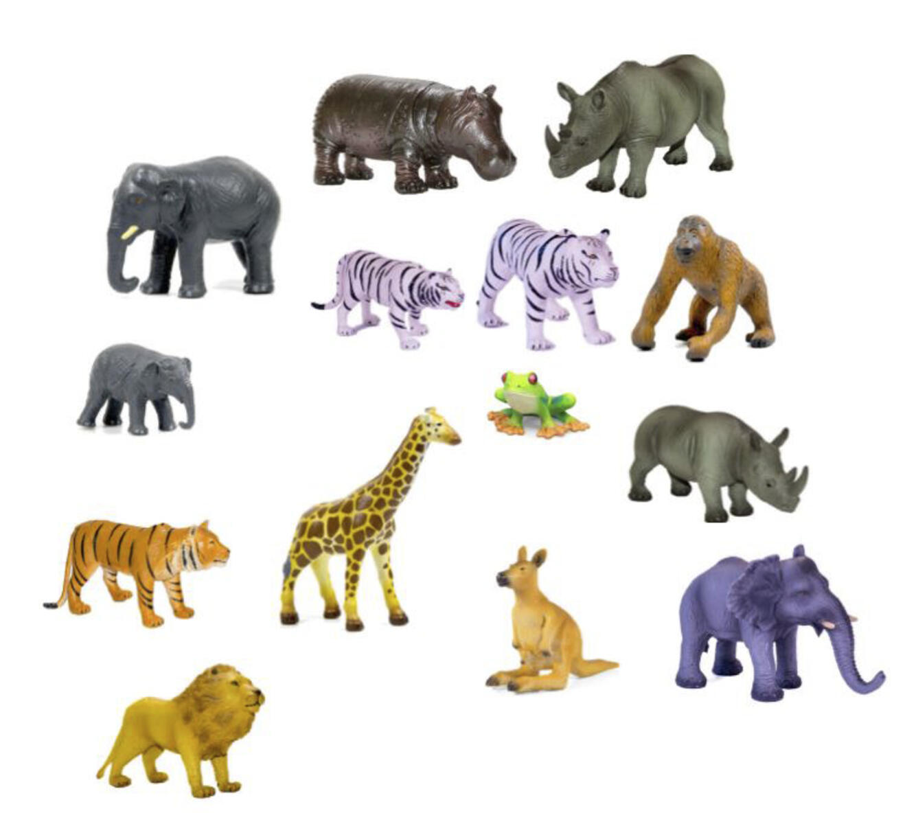 Fine og detaljrike lekedyr. alligator, neshorn, leopard, tiger, kamel, sebra, panter, giraff, løve og elefant. Lengde 10-19 cm. Av PVC uten ftalater. Fra 3 år.