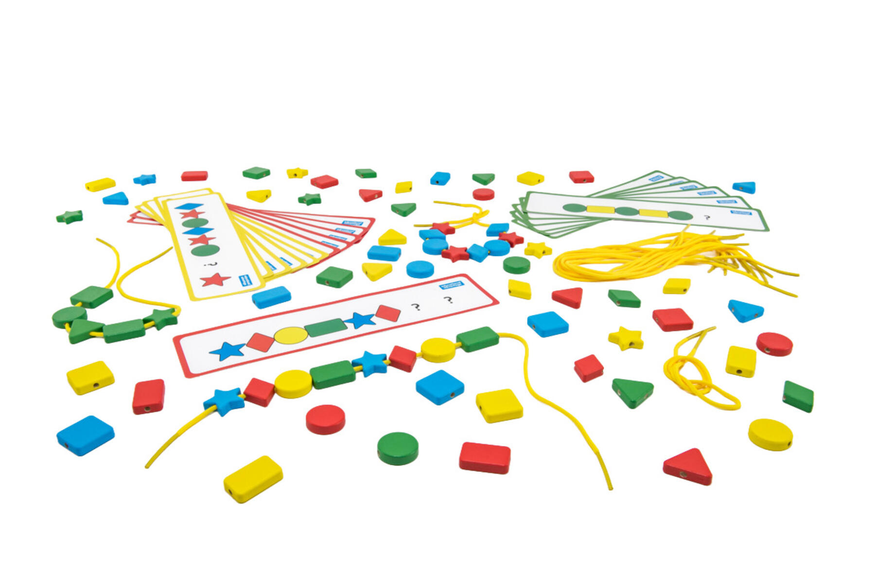 Tren oppfatningen av former, farger og sekvensering mens du utvikler finmotorikk. Velg et arbeidskort og legg den ufullstendige siden opp. La barnet sette sammen den riktige raden og snu kortet for å være sikker på at det er riktig. Kortene har tre forskjellige vanskelighetsgrader. Inneholder 72 treperler i ulike former, 18 arbeidskort og 12 strenger. Laget av FSC-merket tre. Fra 3 år.