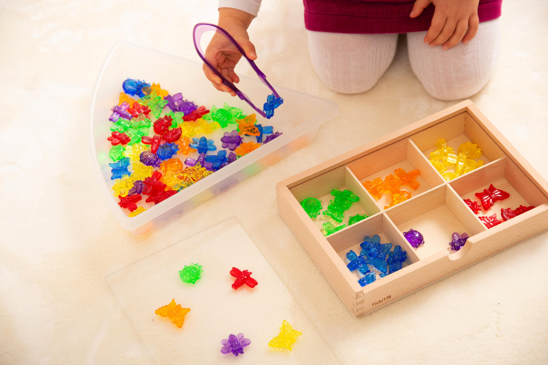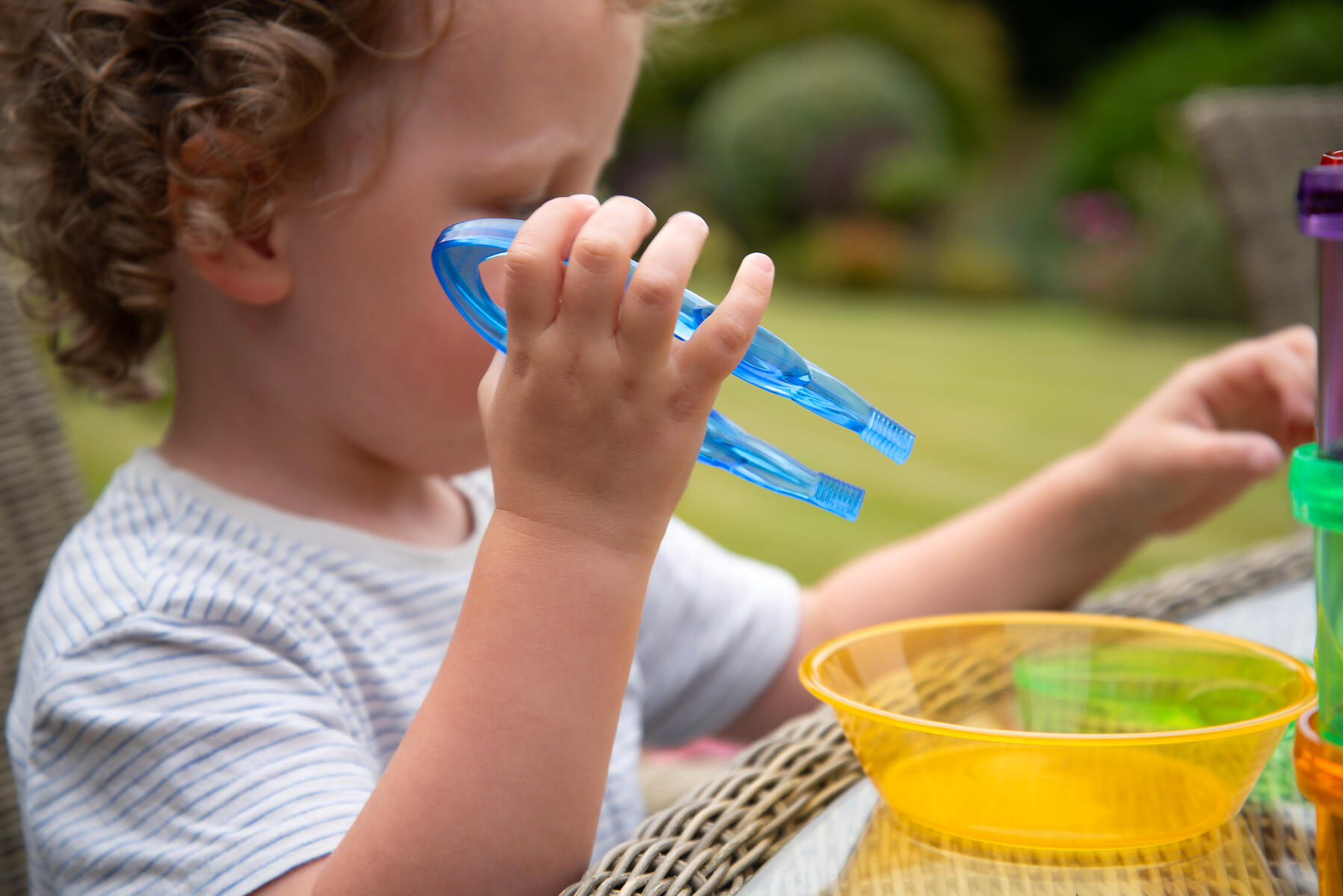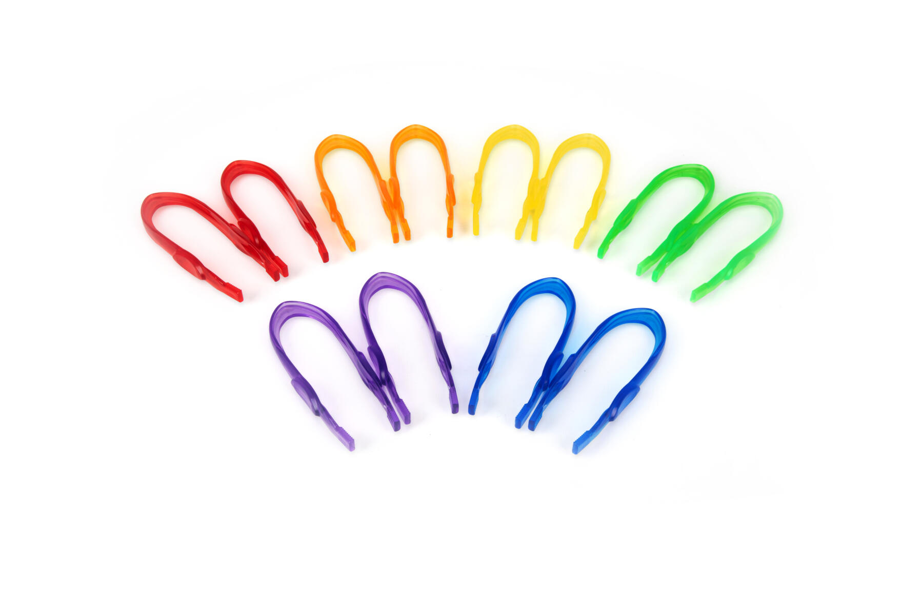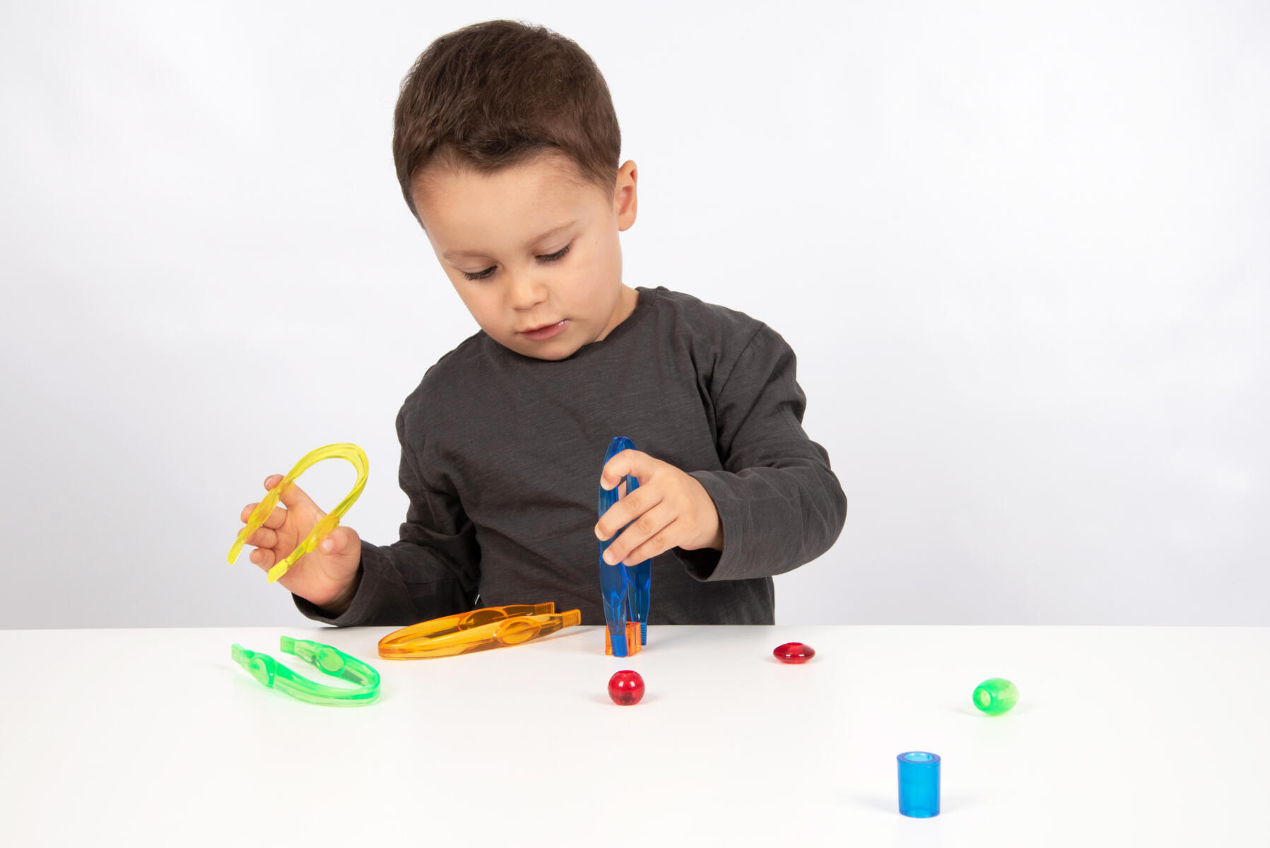 Lyse og morsomme pinsetter med en ideell størrelse for barn å håndtere. Brukes til å plukke opp små gjenstander ved sortering eller mønsterlegging, for å styrke fingre og hender, utvikle koordinasjonsevne og lære om fargeblanding. Inkluderer plastbeholder for praktisk oppbevaring. Laget av akryl. PVC-fri. Fra 18 måneder.