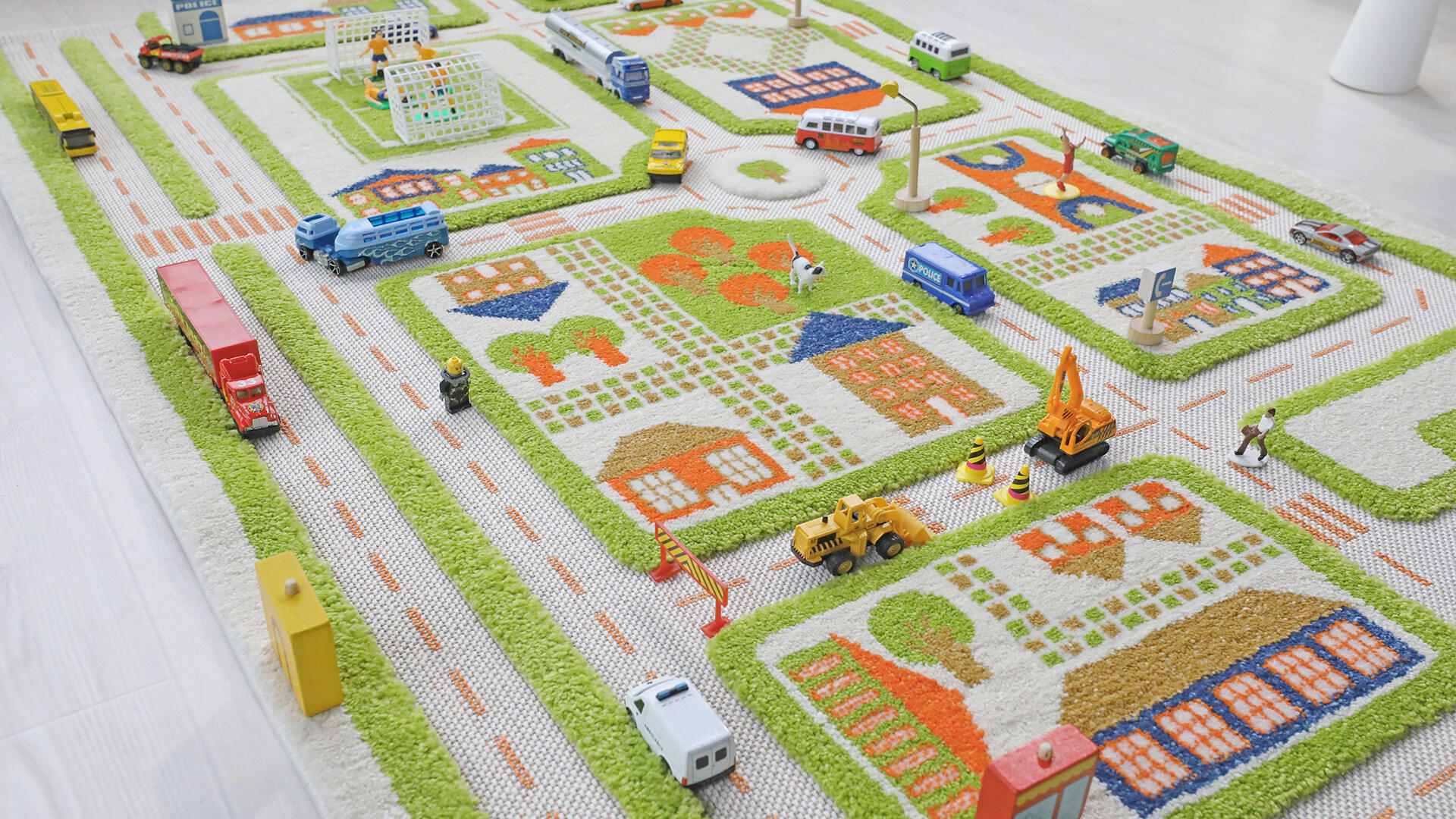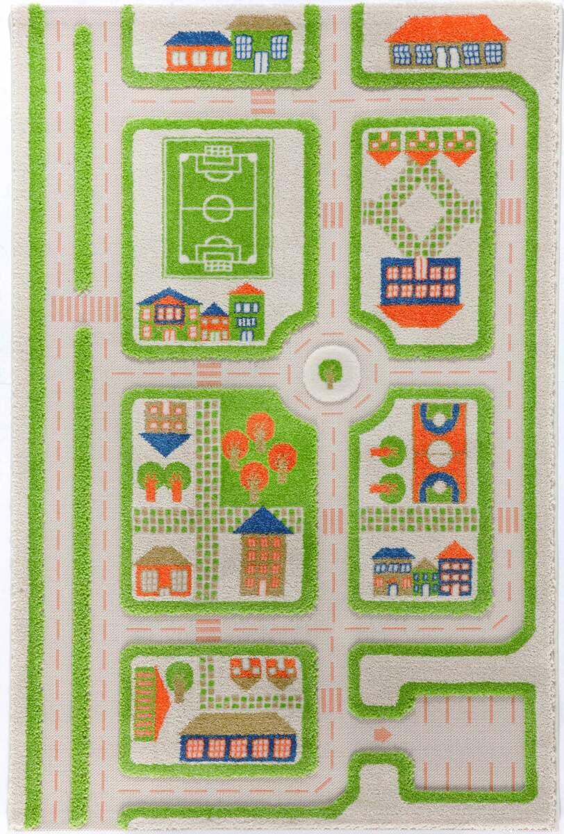 Trafikkteppe med tredimensjonal effekt, med nedsenkede veier og forhøyet struktur. Inspirerer til rollelek med biler, hus og figurer. Laget av polyester og bomull. PVC-fri. Rillet underside, ikke antiskli. Kan renses. Biler og tilbehør følger ikke med.