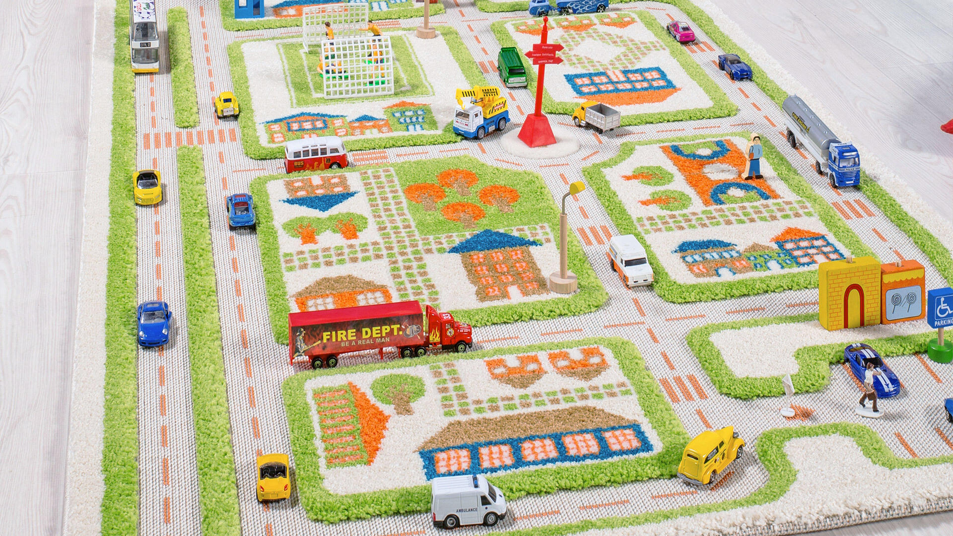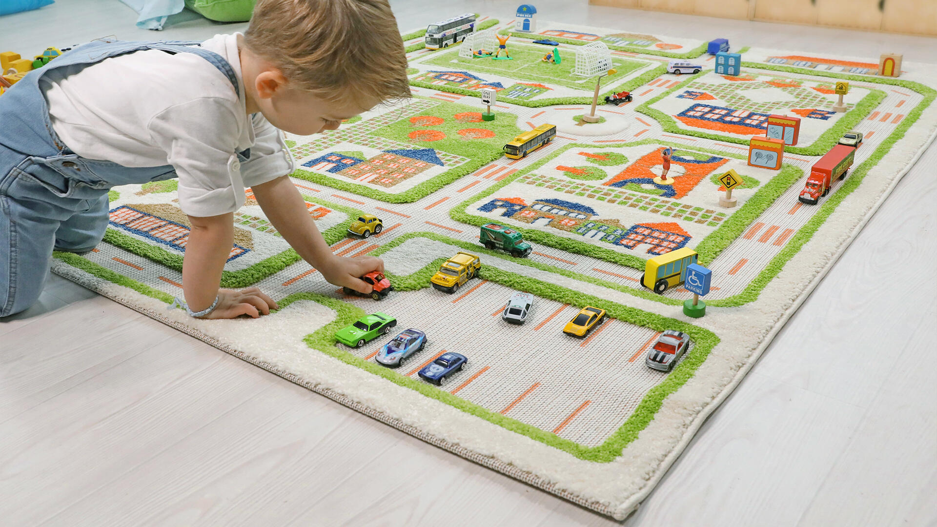 Med den sklisikre lekematten kan barna utvikle fantasi, ordforråd og samarbeidsevne. Biler og bygninger selges separat. Mål: 120 × 78 cm. Lekematten er laget av polyestermateriale med gummiert underside. PVC-fri. Fra 2 år.