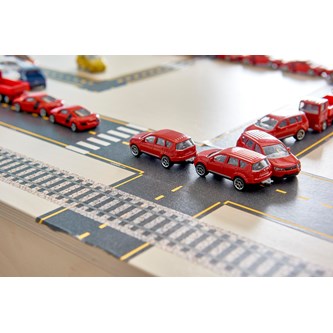 En stor bilbanepuslespill i 30 deler som du kan sette sammen på forskjellige måter. Veibanen er ca 10 cm bred. Overflaten er av 100% polyester og undersiden av gummi, gjør at den ikke sklir. Byggeforslag følger med. Mål ca 100x75 cm.