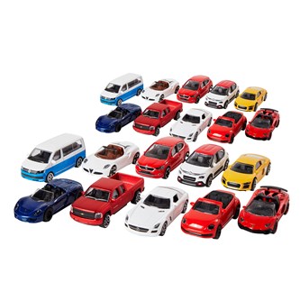 Et stort sett med biler i metall med gummierte dekk og plastdetaljer. Bilsettet inneholder utrykningskjøretøy, arbeidskjøretøy og vanlige biler. Blandede modeller, duplikater forekommer. Lengde ca 7 cm. Fra 3 år.