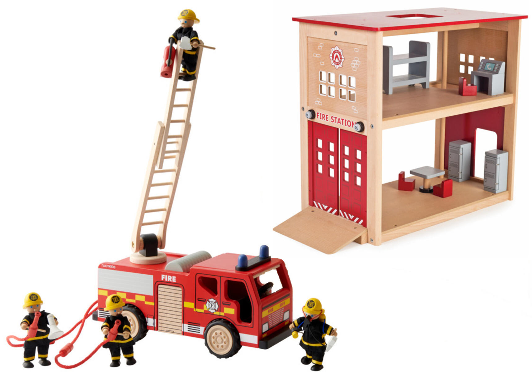 Et komplett sett med brannstasjon i to etasjer med møbler, brannbil med uttrekkbar stige som kan heves og roteres, samt brannmenn med bøyelige armer og ben. Laget av tre – både brannstasjonen og brannbilen er produsert i FSC-merket tre. PVC-fri. Fra 3 år.