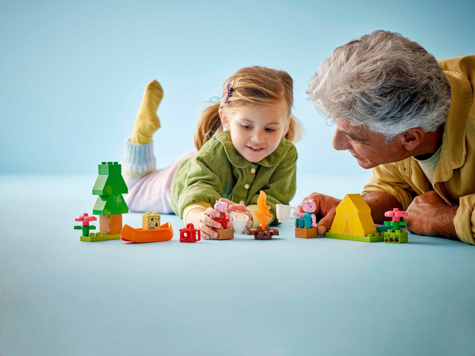 32 deler. Hjelp Pappa Gris og Greta med å sette opp teltet sitt. Legg ut soveposene deres, og oppdag deretter dyrelivet i området og finn marihønene. Bli med dem i kanoen når de utforsker elven. Heldigvis har de et kart slik at de finner veien tilbake til leiren. Samle dere rundt bålet for en kopp varm sjokolade og vis dem bildene du tok med kameraet fra eventyret deres. Materiale: ABS. PVC-fri. Fra 2 år.