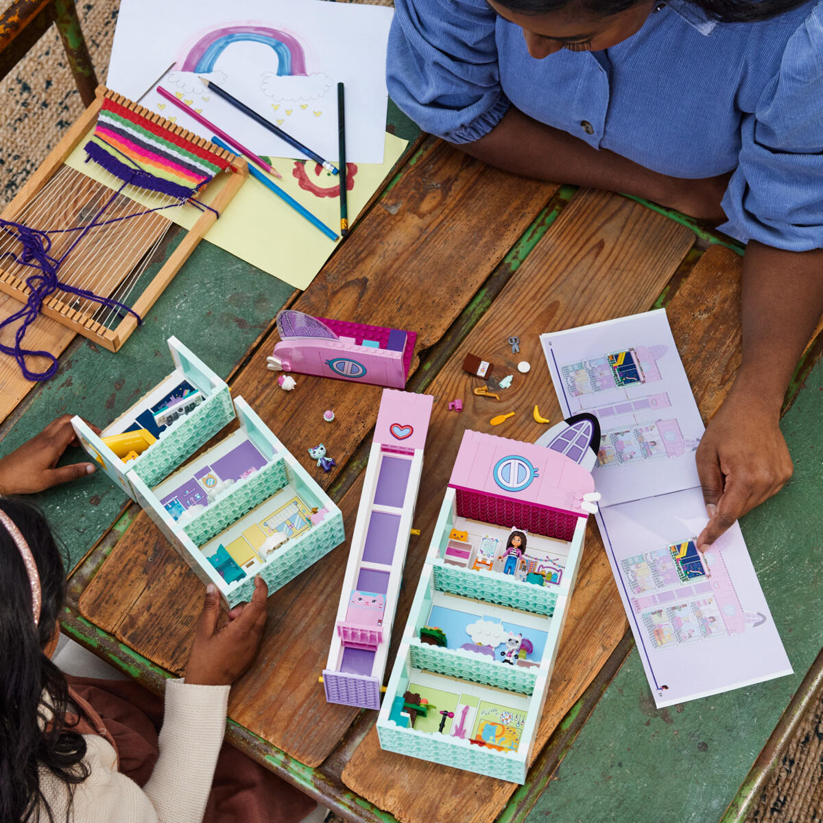 498 deler. Gabbys dukkehus har 8 fargerike rom som er koblet sammen med en skyvbar heis. Hvert rom byr på mange aktiviteter. Barn kan for eksempel bake på kjøkkenet, skli ned sklien i lekerommet, være kreative i hobbyrommet, spille piano i musikkrommet, pynte seg på badet, ta en lur på soverommet eller ha fest på det roterende dansegulvet på takterrassen. En trykt bildegjennomgang viser hensikten med hvert byggetrinn, og i appen LEGO® Builder finnes digitale verktøy for å zoome og rotere, slik at barna kan visualisere modellen mens de bygger. Minifigurer av Gabby, Kattepanda, Sjøkatten og Muffin følger med. Dukkehuset er 34 cm høyt, 31 cm bredt og 9 cm dypt. Materiale: ABS. PVC-fri. Fra 4 år.