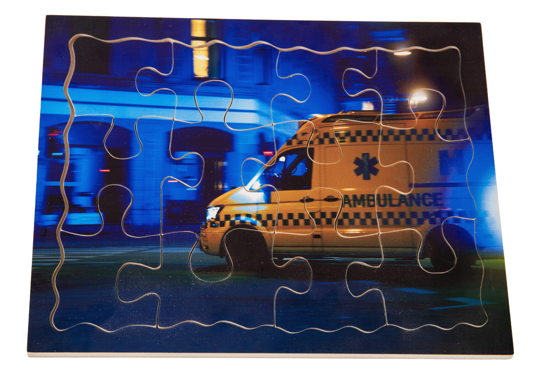 2 puslespill/pk. 12 håndsagede brikker per puslespill. En med fotografisk motiv av en politimotorsykkel og en med ambulanse. Mål: 30x20 cm. Laget av FSC-merket tre. PVC-fri. Fra 3 år.