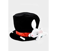 Svart hatt i plysj med rødt satengbånd og skjult lomme inne i hatten. Fløyelkledd tryllestav og hvit plysjkanin med plast nese og øyne inkludert. Maskinvask 40 grader. Laget av polyester. Fra 3 år.