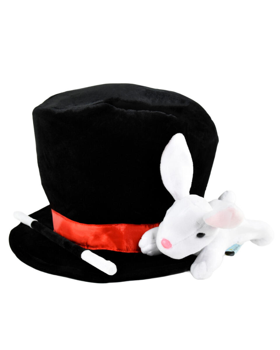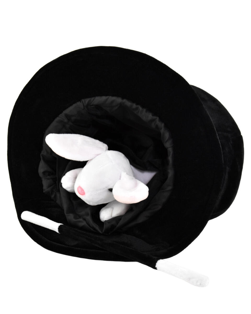 Svart hatt i plysj med rødt satengbånd og skjult lomme inne i hatten. Fløyelkledd tryllestav og hvit plysjkanin med plast nese og øyne inkludert. Maskinvask 40 grader. Laget av polyester. Fra 3 år.