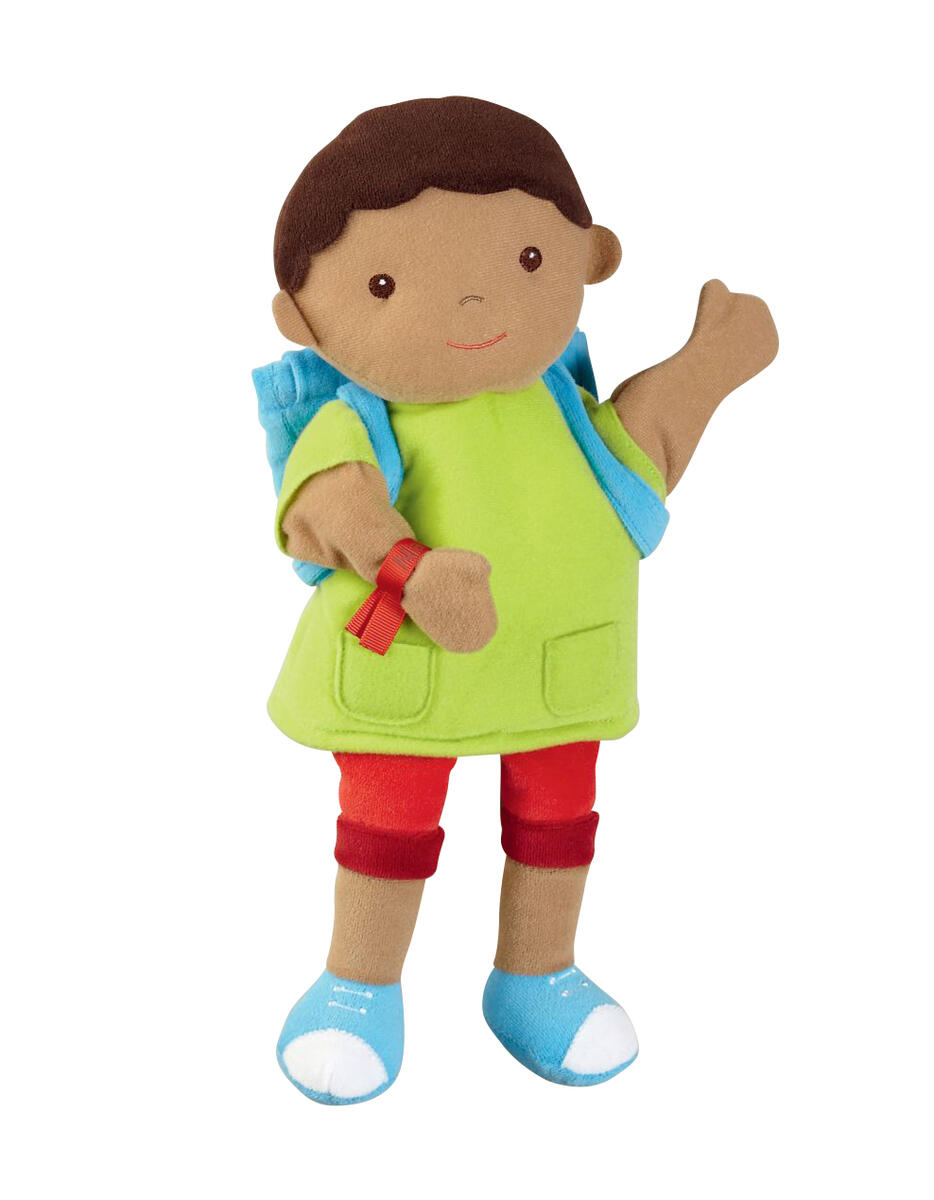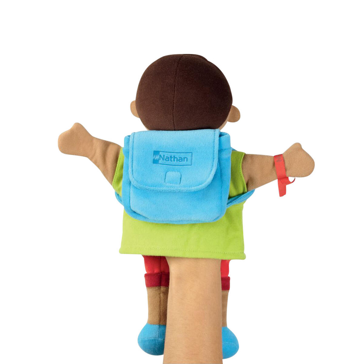 Søt hånddukke for språklige og kommunikative aktiviteter. Hånddukken Tom har avtagbar ryggsekk med plass til små overraskelser. Ryggsekken er festet med borrelås. Lengde 32 cm
