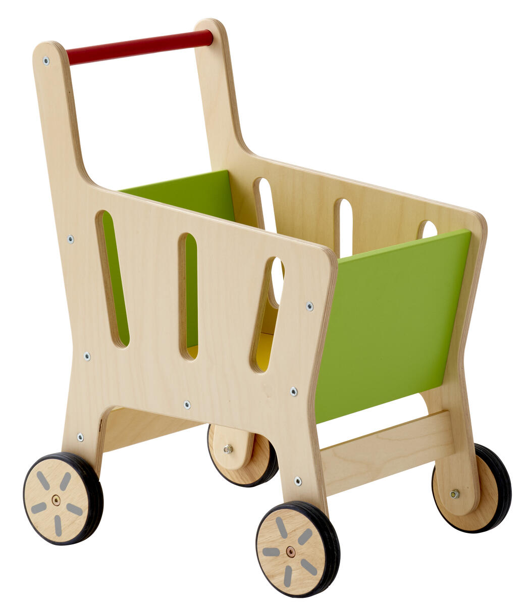 En stabil handlevogn med forsterket bunnplate. Koordinert med andre produkter i Lekolars Playwood-serie. Av FSC-merket kryssfiner og håndtak av metall. Mål: 43x30,5x55 cm. Fra 1 år.