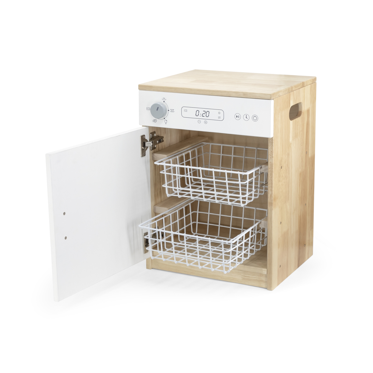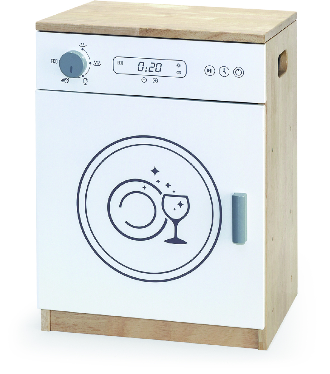 Oppvaskmaskinen har et minimalistisk design med en hvit dør som kan åpnes og lukkes. Oppvaskmaskinen har uttrekkbare trådkurver slik at barnet enkelt kan sette inn skitne tallerkener og glass. Det er også en dreieknapp og fine illustrasjoner på forsiden av maskinen. Mål: 55x40x36 cm. Leveres umontert. Skal festes i vegg. Laget av FSC-merket kryssfiner og tre. PVC-fritt. Fra 3 år.