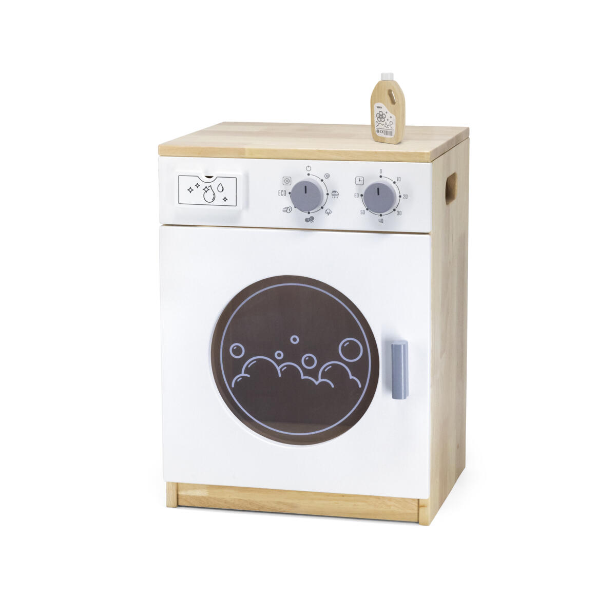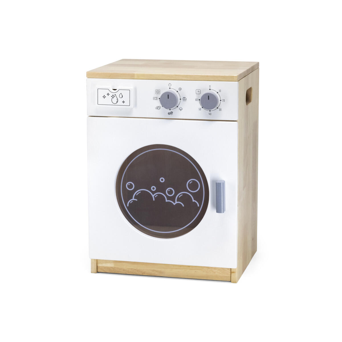 Vaskemaskin til rollelek med innstillingsknapper og frontluke. Leveres umontert. Mål: 54,7 x 36,4 x 40 cm. Laget av FSC-merket kryssfiner og tre. PVC-fri. Fra 3 år.