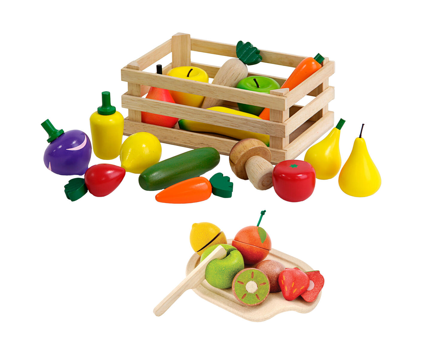 17 deler/pk. Inneholder løk, gulrøtter, agurk, tomat, reddiker, hvitløk, sitron, melon mm. Matvarer av FSC-merket plantet gummitre. Mål gulrot: 12 cm. Fra 3 år.