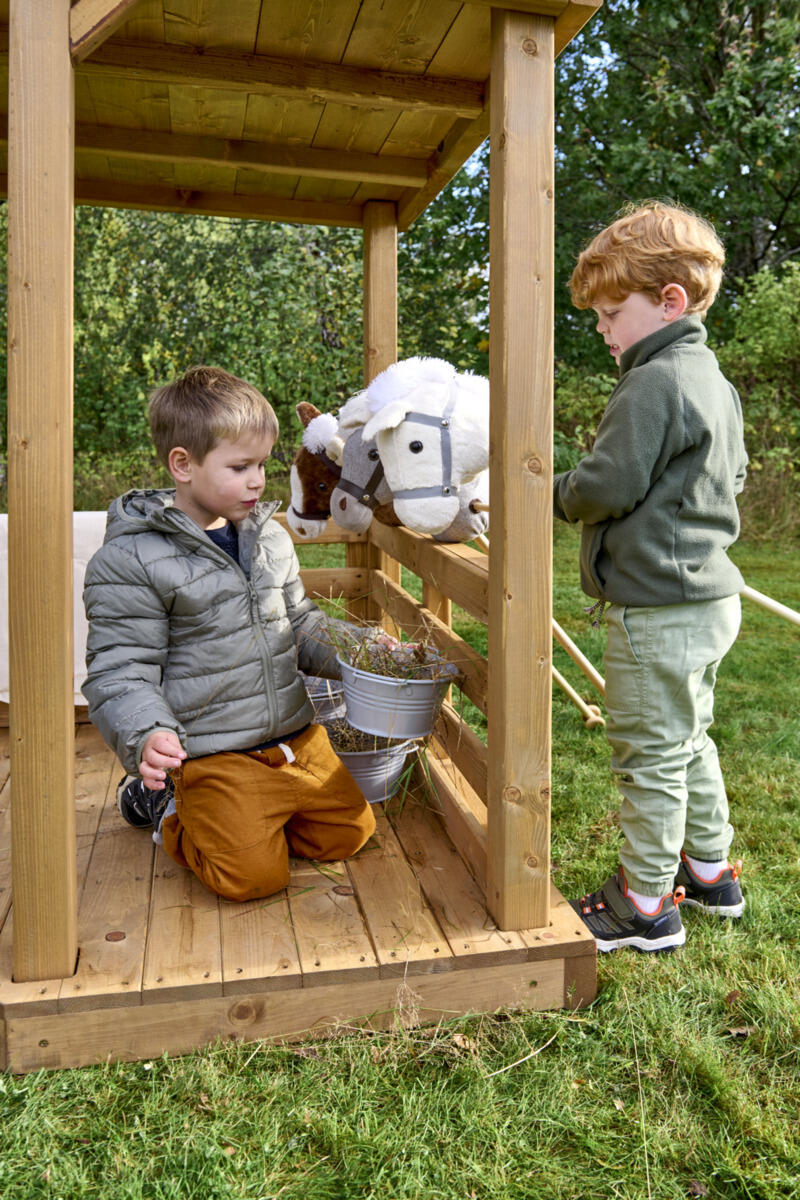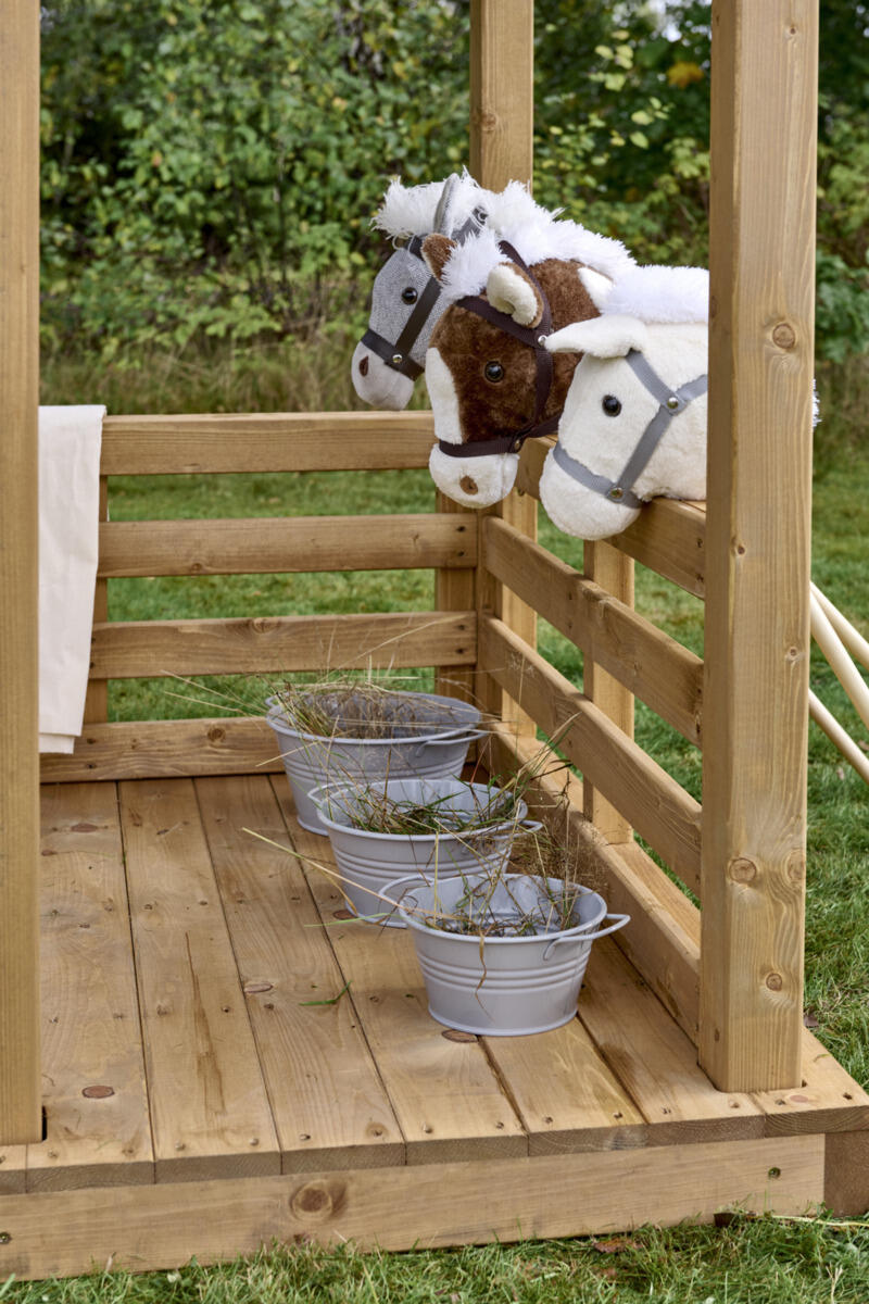 Stall med 2 båser til kjepphestene. To åpningsbare porter gjør det enkelt å ta hestene inn og ut. Til hver hest er det en avtakbar høyholder og en liten tavle der hestens navn kan skrives. Mål: 60x22,5x104 cm. Laget av FSC-merket tre, MDF og kryssfiner. Fra 3 år.