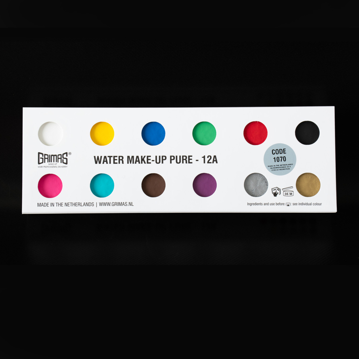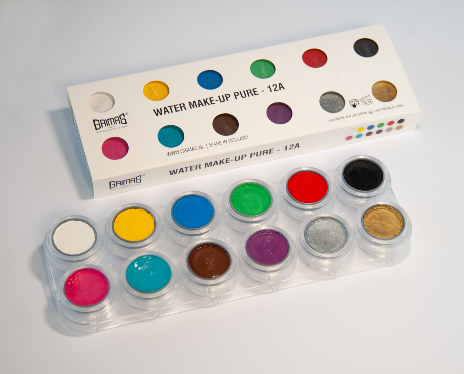 12 farger, 2,5 ml pr farge. Vannbasert sminke til karneval for ansikts- og kroppsmaling. Hurtigtørkende, perfekt dekning, uparfymert og glutenfritt. Lett å fjerne med såpe og vann.