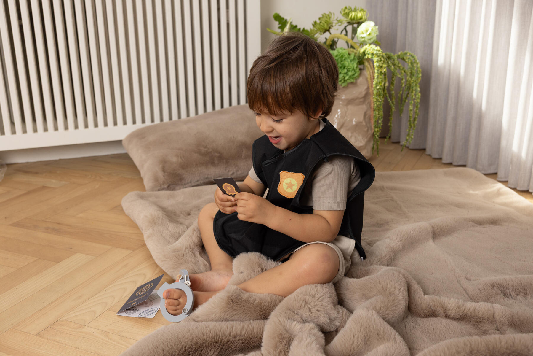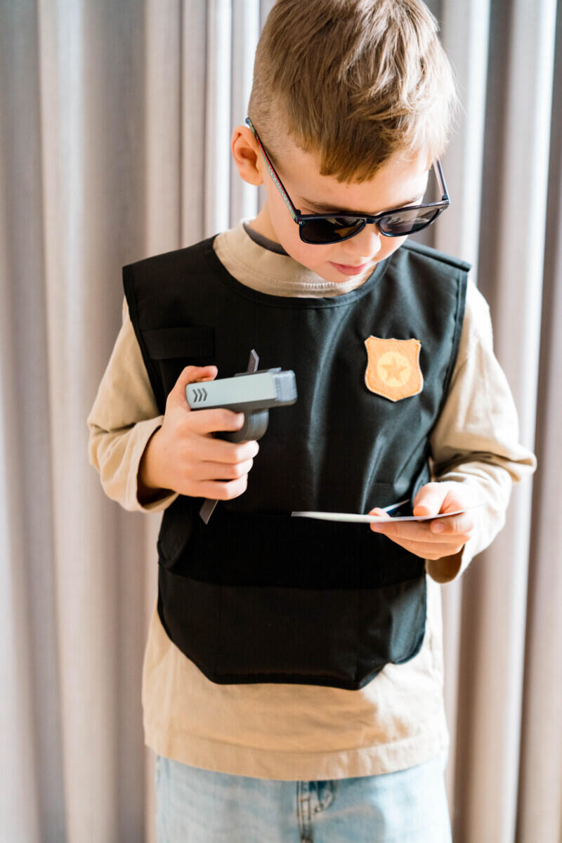 5 deler. Inneholder håndjern, en lekepistol, en lommelykt, en politivest og et politimerke. Perfekt for små politibetjenter som elsker å være hverdagshelter. Laget av FSC-merket tre, bomull og MDF. PVC-fritt. Fra 3 år.