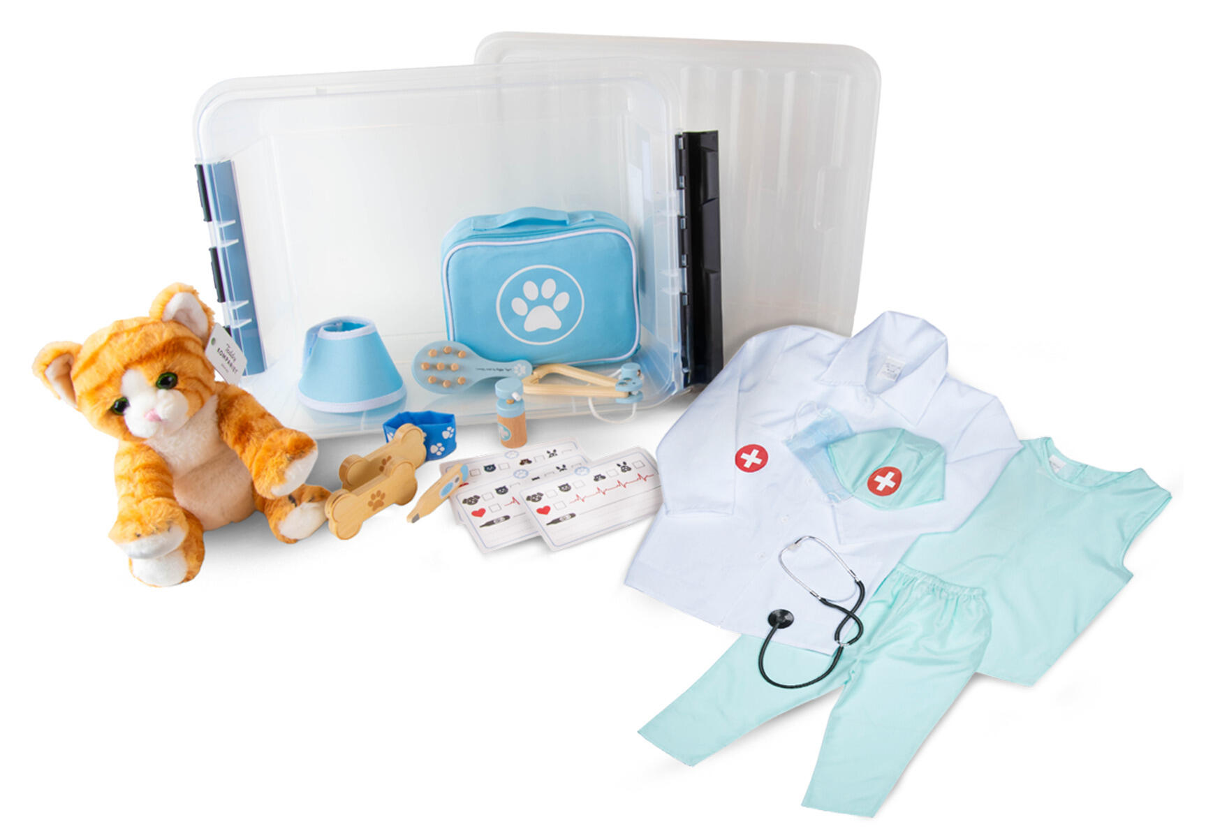 12 deler. Alt en ung dyrlege trenger for å ta vare på syke bamser eller syke dyr for å bli frisk. Mål: 8,5x15x20 cm. Laget av FSC-merket tre, polyester og bomull. PVC-fri. Fra 3 år.