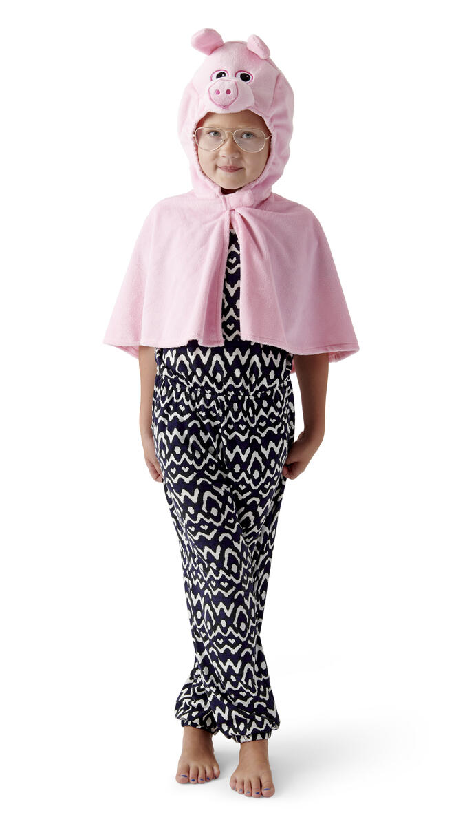 En fin og myk kappe til utkledning med hette formet som en gris. Borrelås gjør den enkel å ta på og av. Av myk polyesterplysj. Håndvask. Passer for 3-6 år.