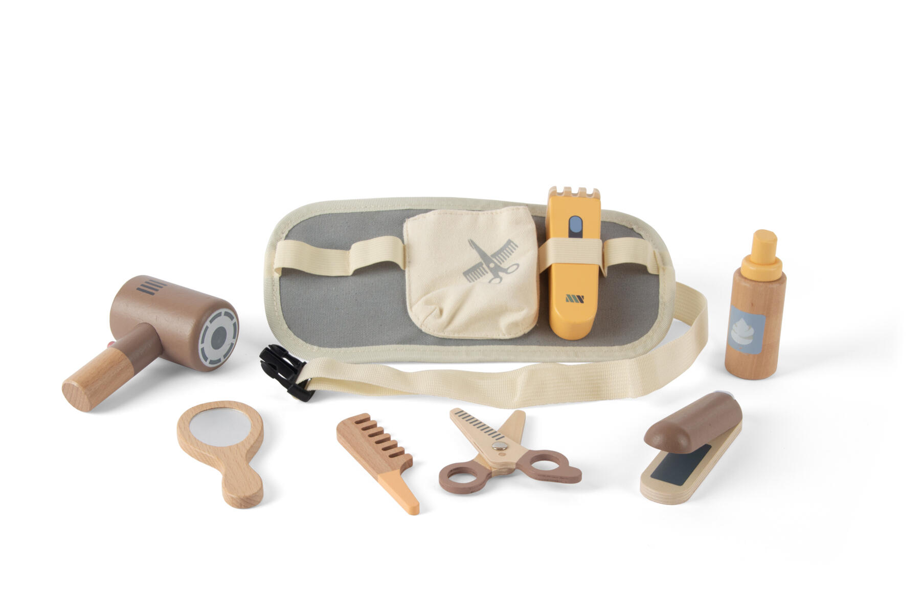 Et praktisk stoffbelte for den kreative frisøren. Justerbart belte med plastspenne. Inneholder hårføner, rettetang, kam, saks og speil. Laget av polyester og FSC-merket tre. PVC-fri. Fra 3 år.
