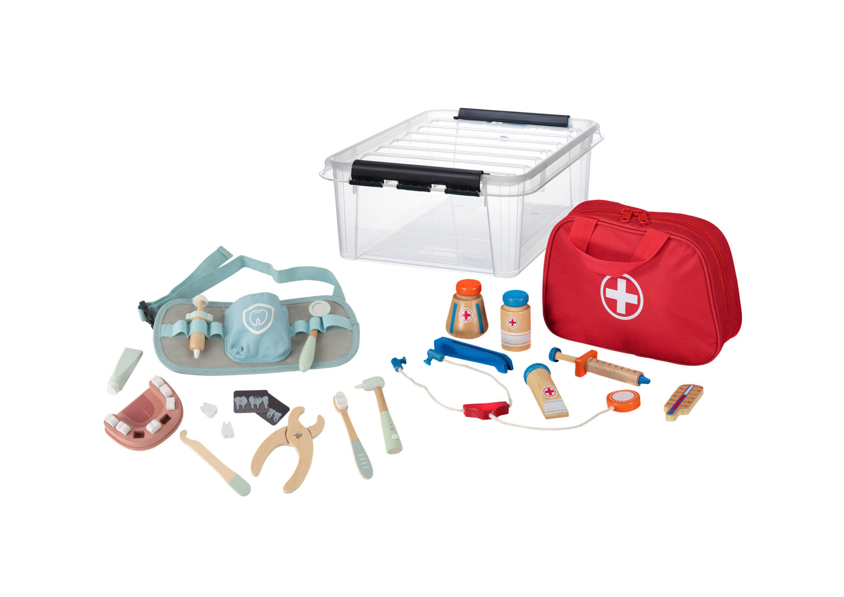 Denne lekekassen for rollelek inneholder en utkledningsdrakt lege, en legeveske, et lekesett tannlege og en oppbevaringsboks med lokk. PVC-fri. Fra 3 år.