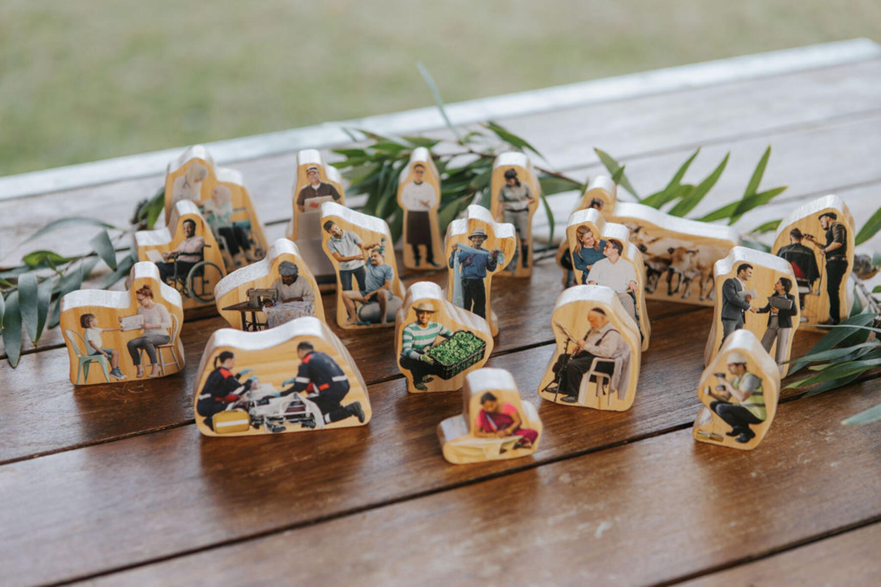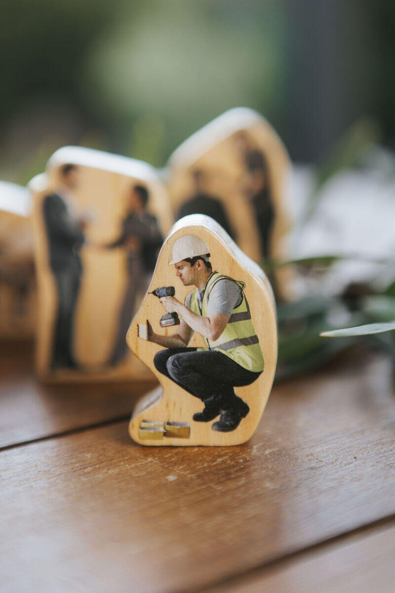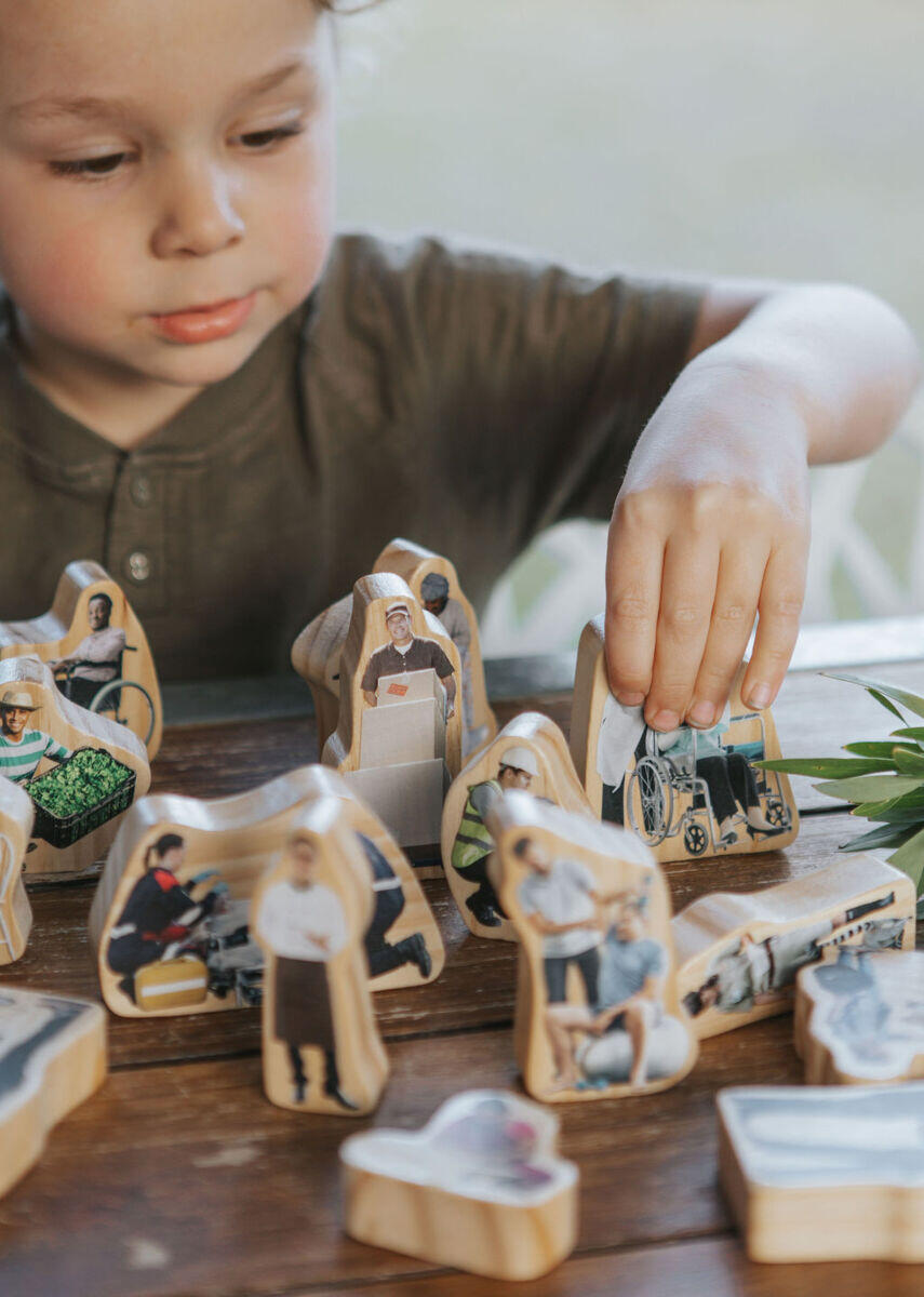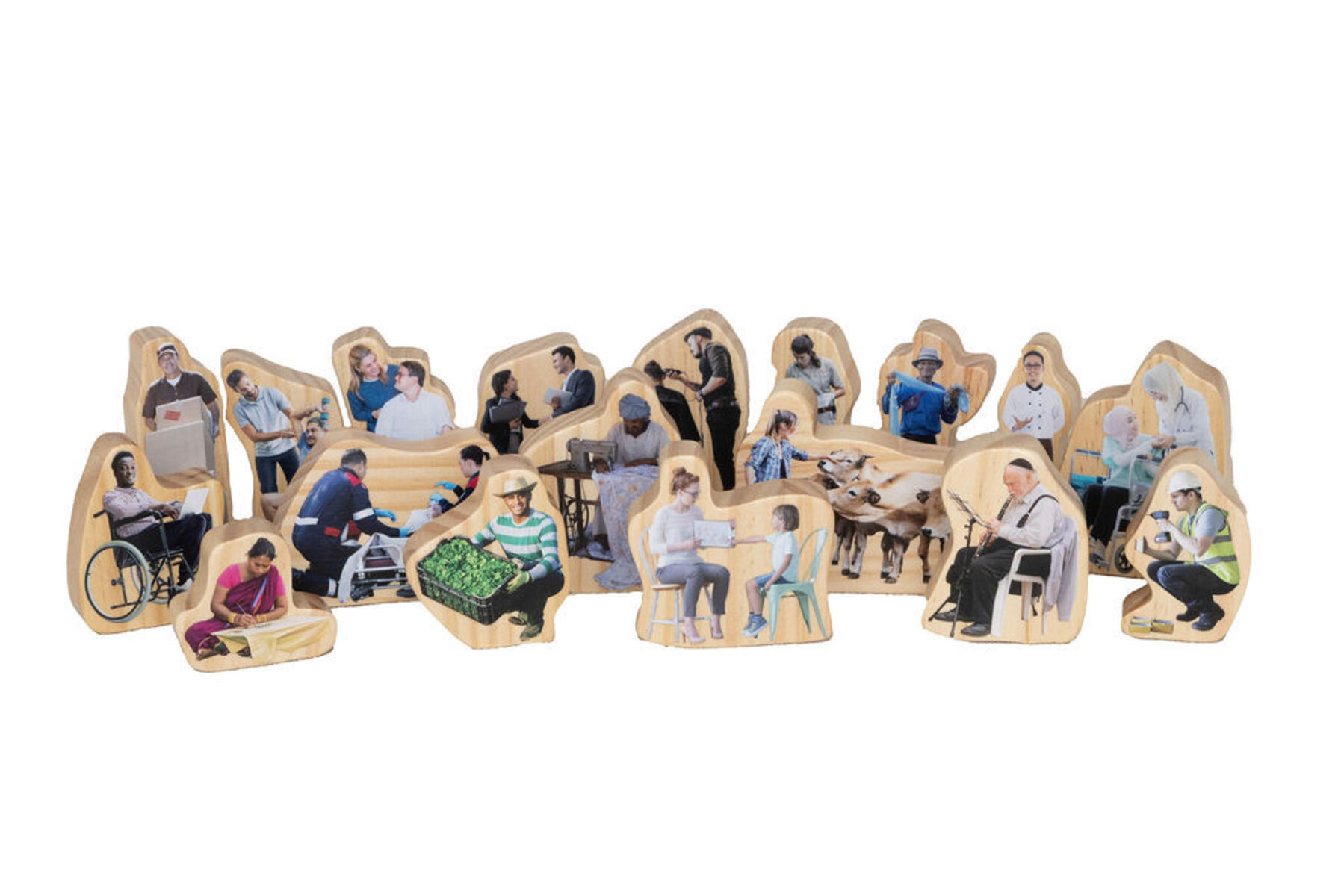 Feir våre helter som holder samfunnet i gang. Med disse trefigurene ser vi mange yrker som får verden til å fungere – fra brannmenn til leger, kokker, lærere og postbud. Det er også tydelig fokus på mangfold og inkludering. Figurene passer godt til lek eller som utgangspunkt for samtaler om samfunnet vårt. Mål: minste 6x5x4,5x2 cm, største 11,5x7,5x2 cm. Fra 1 år.