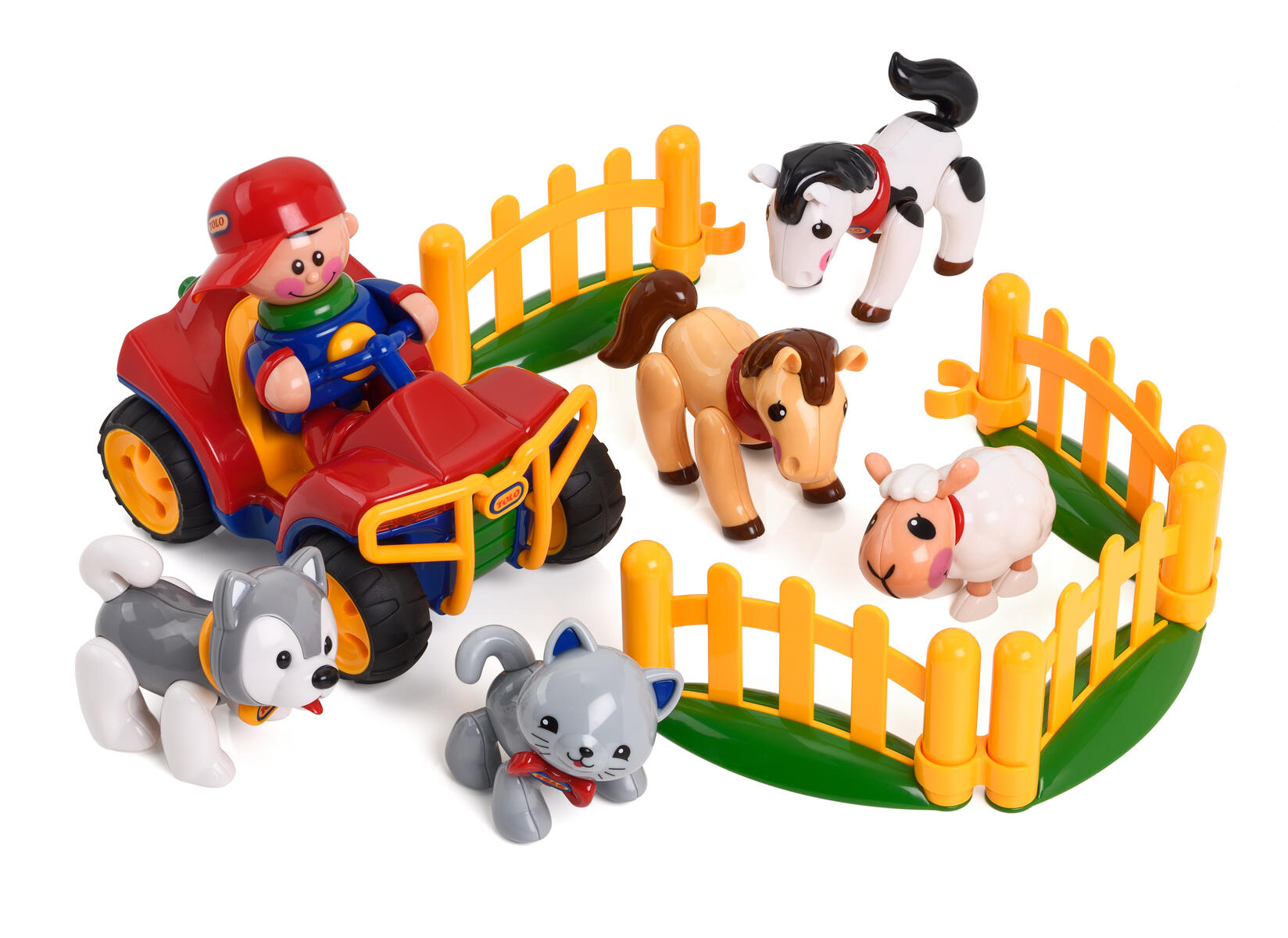 Kjør en firhjuling eller bygg en innhegning for dyrene. Inkluderer en huskyhund, en katt, to hester og en sau. Dyrene har en rekke bevegelige og klikkende hoder, haler og ben. Firehjulingen kommer med pull-backmotor, men kan også kjøres på frihjul. Oppmuntrer til bevegelse og samarbeid. Laget av ABS. Fra 12 måneder.
