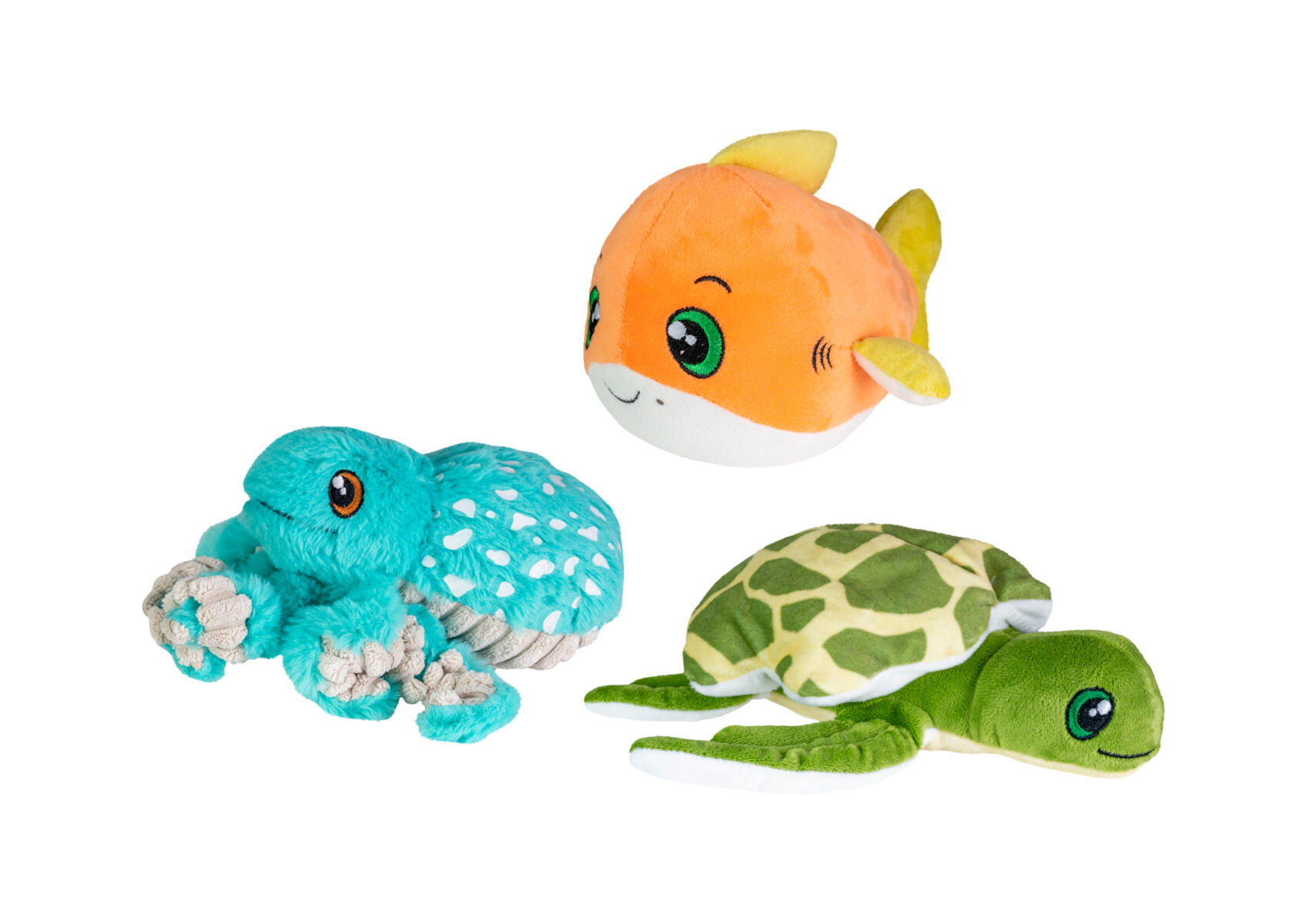 3 stk/pk. Våre venner fra havet Konna, Frans og Fisu som er laget av plastflasker som er renset opp av vannet. Dyrene er 100 % resirkulerbare. Lengde ca 22 cm. PVC-fri. Fra 0 år.