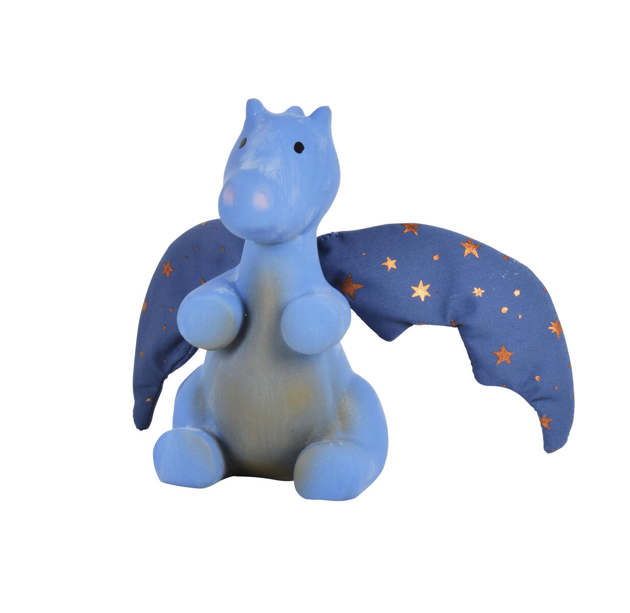 En fin drage med myk ranglelyd og vinger. Av naturgummi og vinger av økologisk bomull. Høyde 14 cm. Fra 0 år.