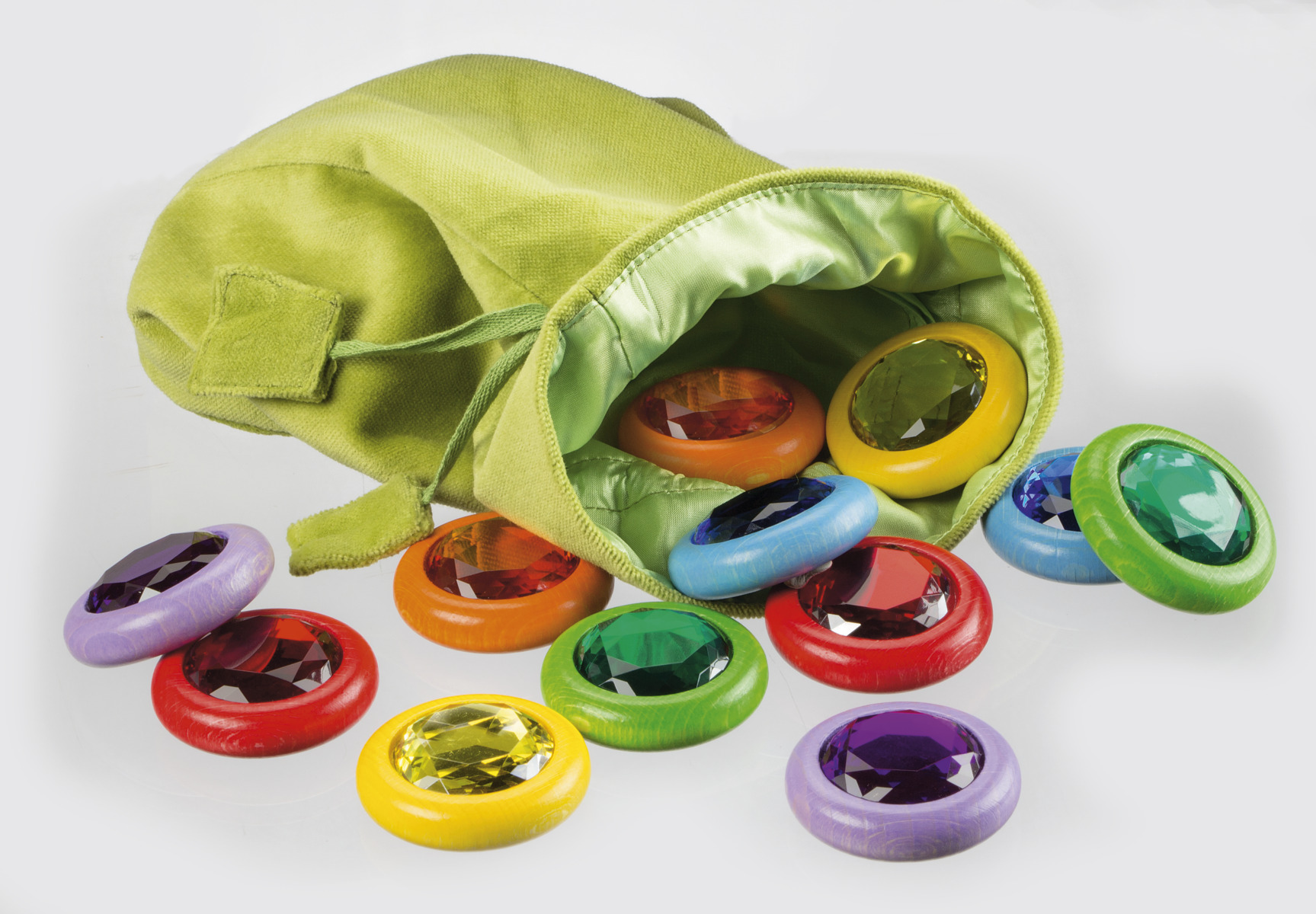 24 stk. Flotte tresteiner med en juvel i. Fint å sortere og telle mens du kan bli kjent med de forskjellige fargene. Leveres i fløyelspose. Mål: 4,5 cm. Fra 18 måneder.