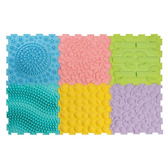 6 teppestykker i forskjellige taktile materialer og farger som kan settes sammen til en lekematte. En spennende taktil og visuell opplevelse. Mål på hver del ca 30x30 cm.