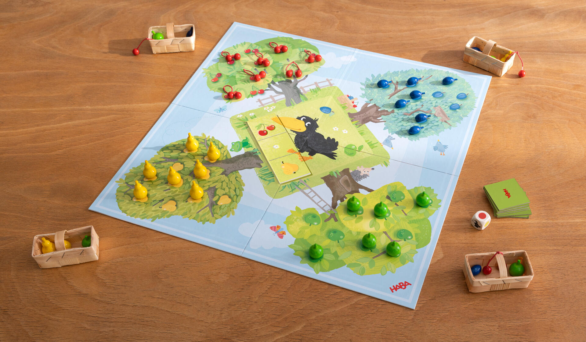 Et samarbeidsspill for de yngre barna. Etter tur slås terningen og frukten flyttes til kurven før kråka kommer i mål. Trener farger, samarbeid og motorikk. Frukt av tre, mål ca 3,5x4,5 cm. 1-4 spillere. Fra 2 år.