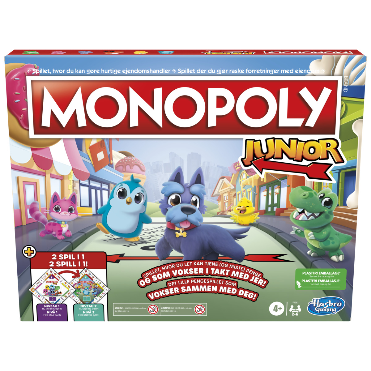 Monopol for de minste. Dobbelsidig spillebrett med 2 spillenivåer. En side fokuserer på telling og matcing, og er beregnet for barn i alderen 4-5 år. Vend spillebrettet for et mer avansert spill med fokus på lesing og enkel matematikk, for barn fra 6 år. Hvert spillenivå har sine egne Monopolpenger og Monopolkort, samt regler. For 2-6 spillere. Fra 4 år.