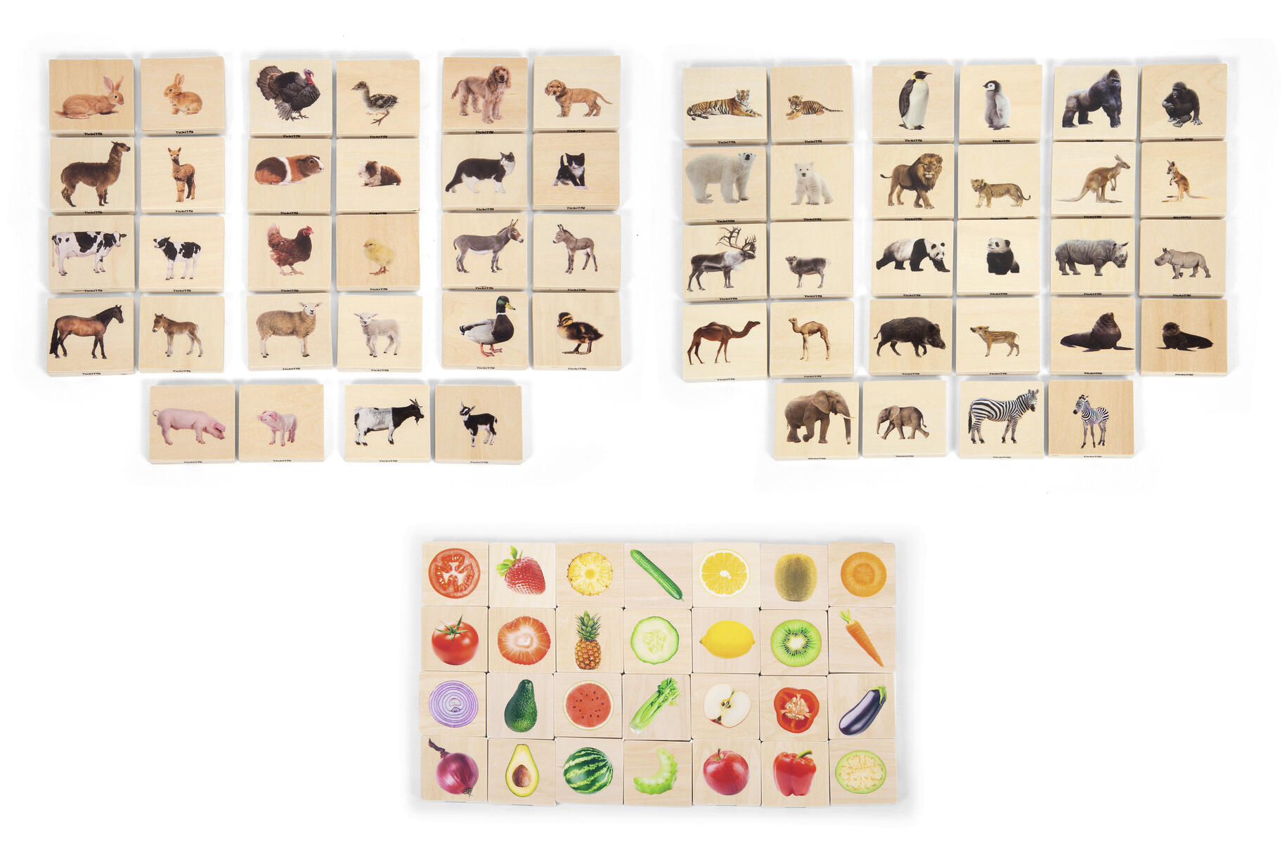 Lag 14 par med frukt og grønnsaker. Finn bilde av frukten og hvordan den ser ut inni. Fine fotografiske bilder. Store deler av bøk. Mål: 7x7x1 cm. Fra 1 år.