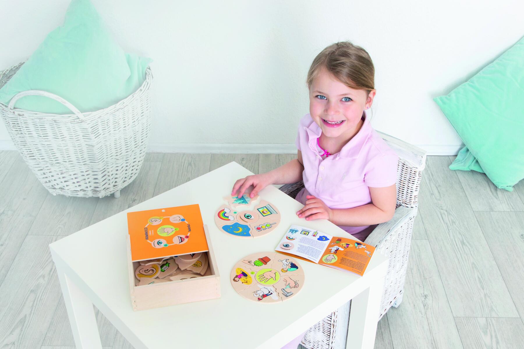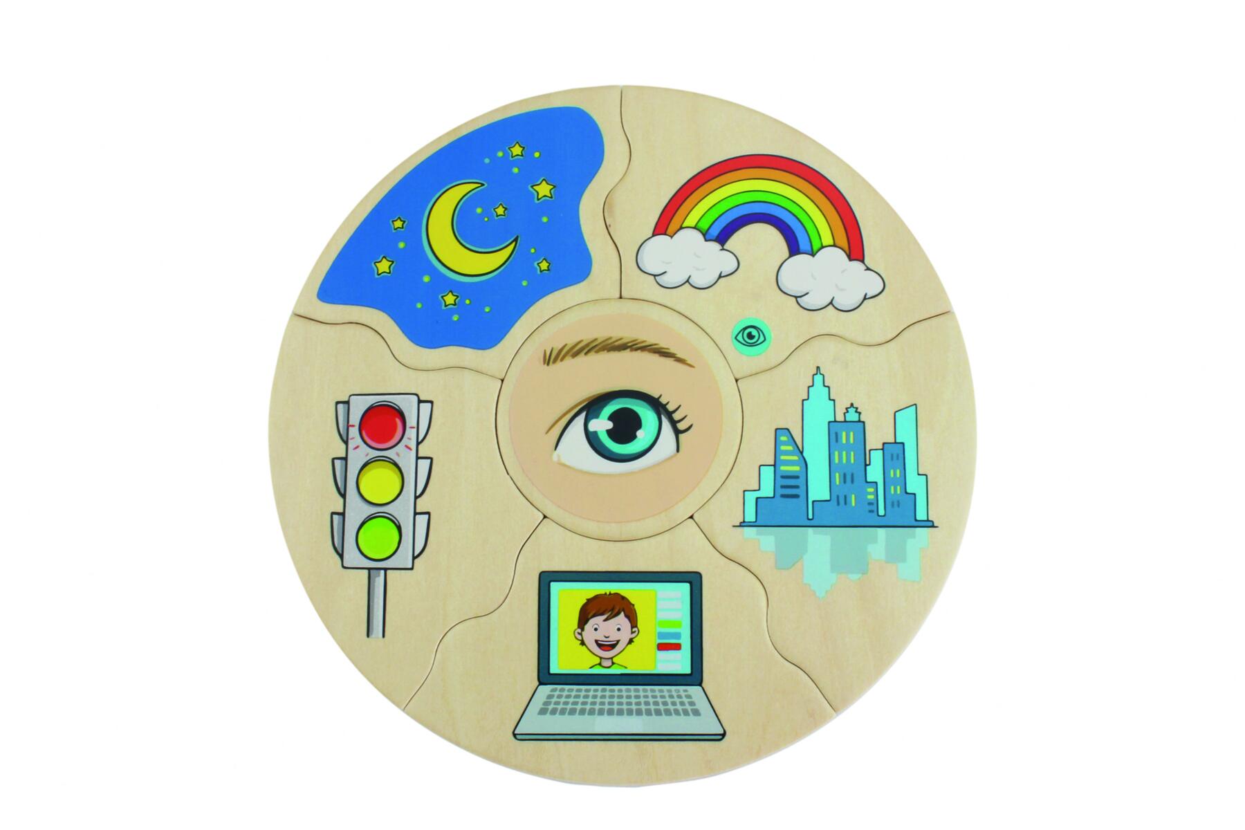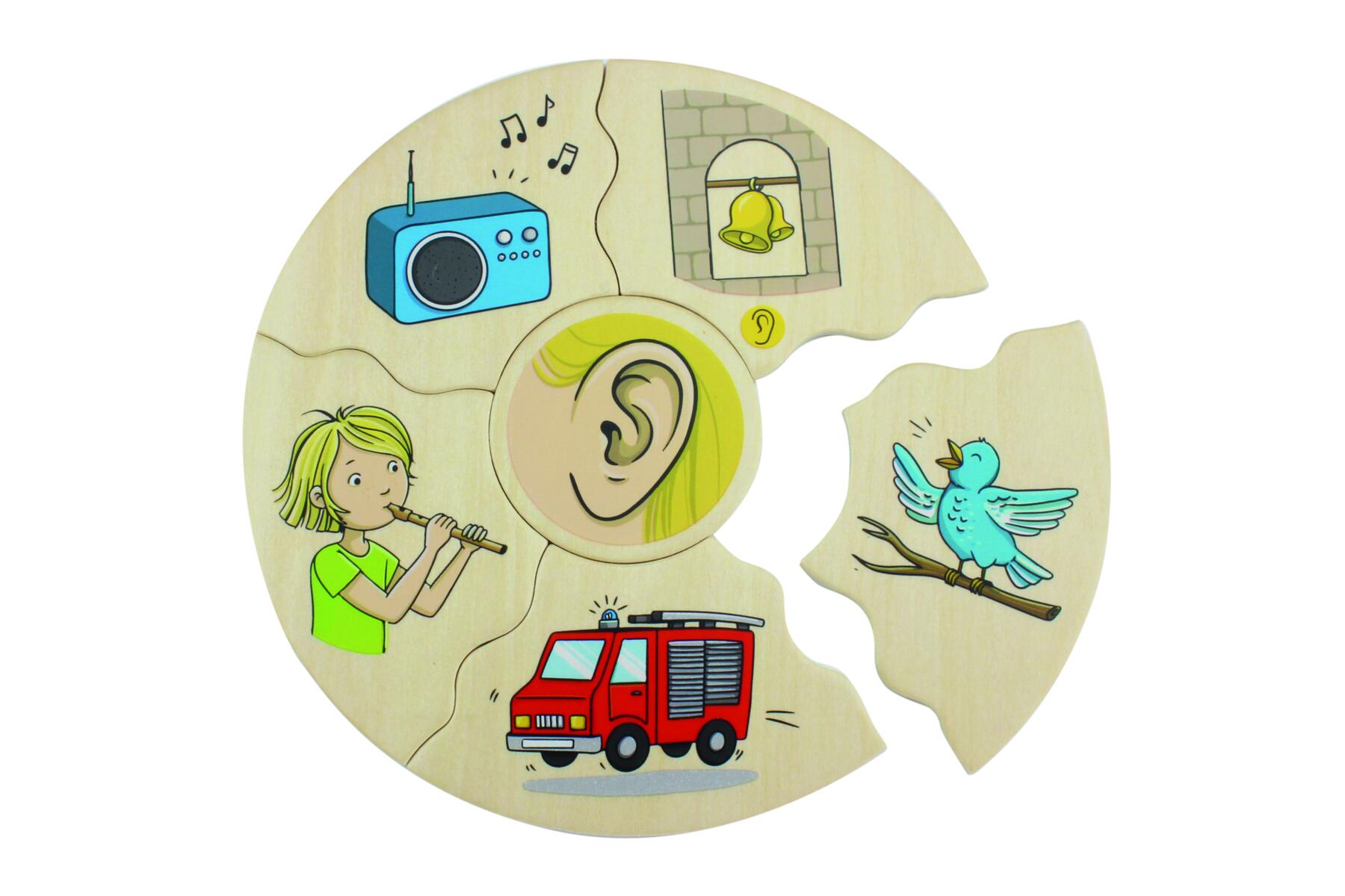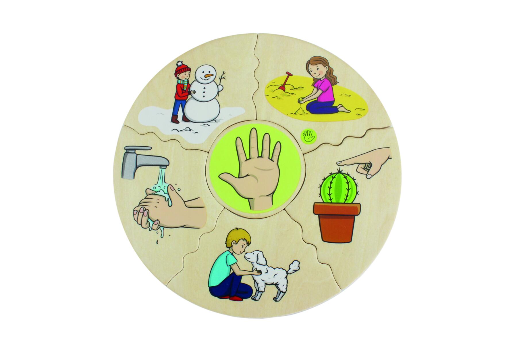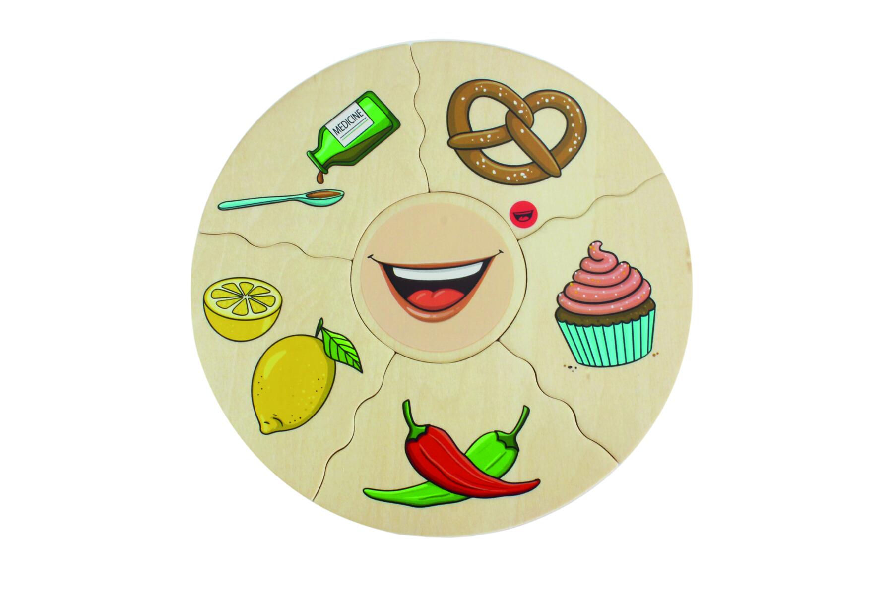 Et morsomt spill der man velger en midtdel, snur alle de andre brikkene opp ned og blander dem. Deretter bytter man på å snu brikker for å se hvem som får ferdig kaken sin først. I denne versjonen utforskes sansene våre. Laget av FSC-miks. Mål: 16 cm. Fra 3 år.