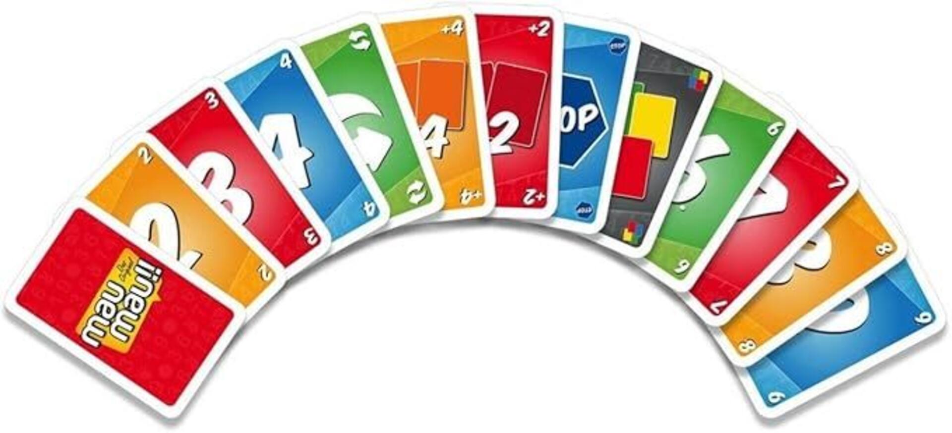 110 kort. Et kortspill som går ut på å spille bort kortene dine etter farge og verdi. 4 forskjellige farger og 9 valører samt 5 spesialkort hvorav disse er, stoppkort (du stopper neste spillerens tur), snukort (du endrer retningen på spillet), +2 (neste spilleren trekker 2 kort), 4+ (neste spiller trekker 4 kort), fargeendring (du kan velge hvilken farge du vil spille i stedet). 5 kort deles ut til hver spiller og spilleren til venstre begynner å legge ut et kort. Den neste spilleren følger enten farge eller valør. Kan du ikke legge noen av kortene dine må du trekke et kort fra bunken, kan du heller ikke spille dette kortet tar du opp bunken i hånden. Når du har ett kort igjen, sier du høyt «Mau Mau». Den første personen som spiller sitt siste kort vinner. For 2-6 spillere. Fra 6 år.