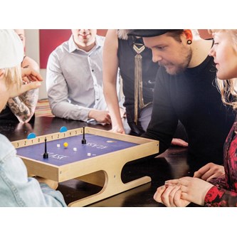 Klask er et morsomt spill som går fort å lære og passer for alle aldre. Du forsøker å skyte en ball i motstanderens mål, men kan også vinne ved at motstanderen får to hvite magneter på sin styrepinne eller om mostanderens styrepinne går inn i eget mål. Spilletid ca 10 min. For 2 spillere.