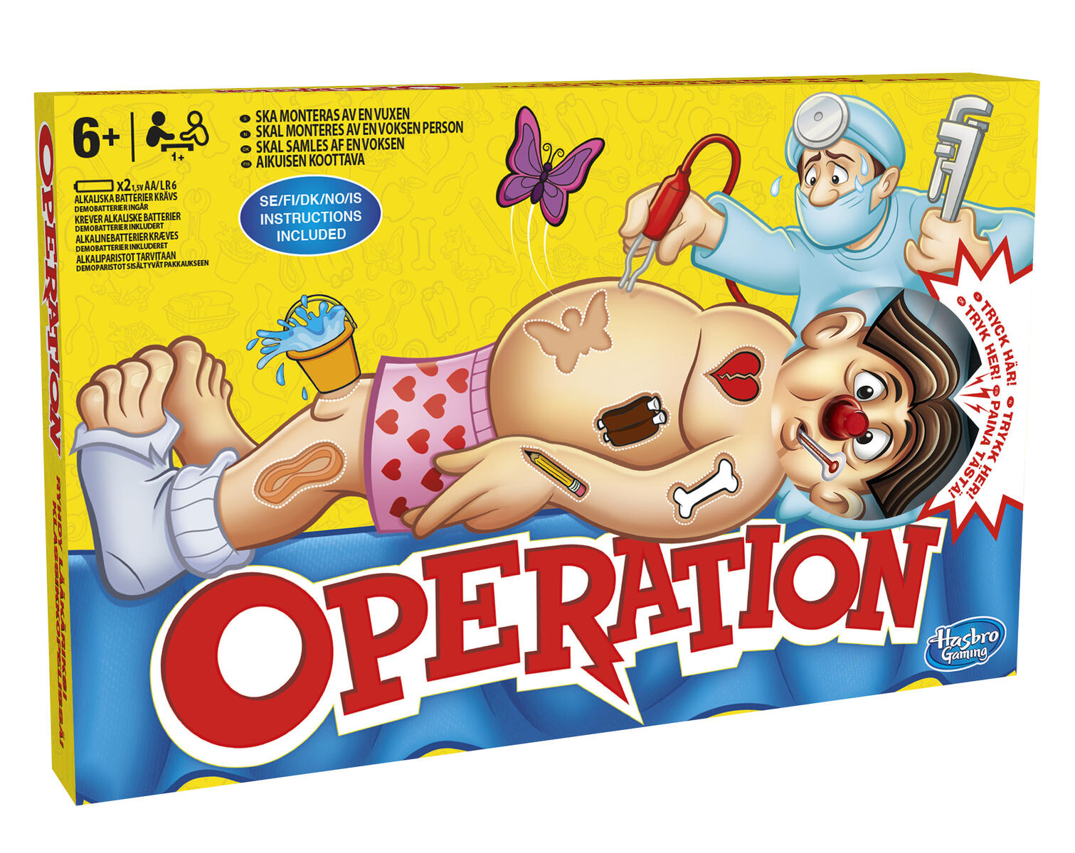 Et spill som utfordrer sansen. Velg et kort og utfør operasjonen. Med nye sykdommer som sms-tommel og digital integrering finnes det ingen ende på galskapen. Lek doktor og unngå den surrende lyden. Du belønnes med penger hvis du klarer oppdraget uten å utløse den surrende lyden. Krever 2 stk AA batterier, følger ikke med. Fra 6 år.
